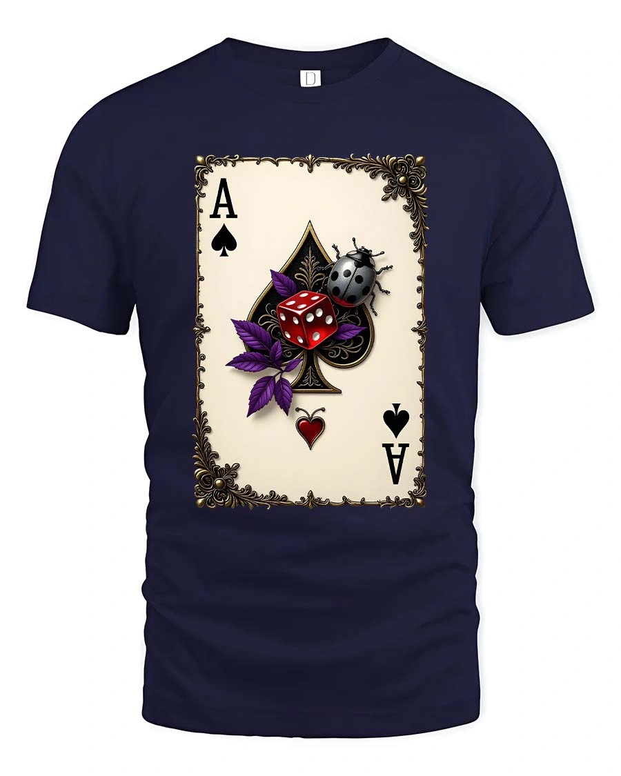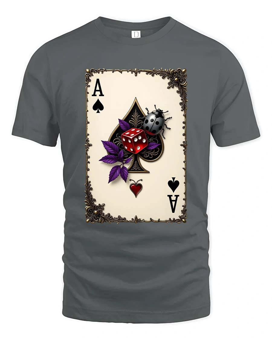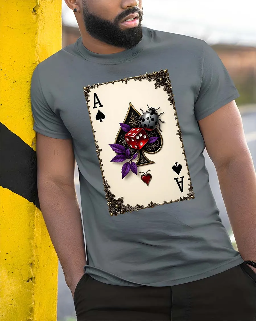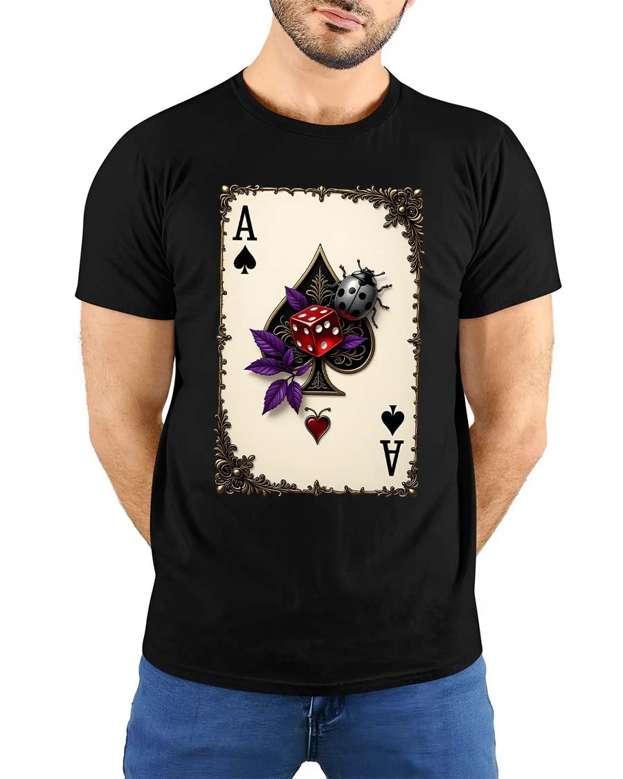 Featuring a striking ace of spades card paired with vivid dice and a detailed ladybug, this graphic tee blends luck, mystery, and vintage style into one unforgettable piece.