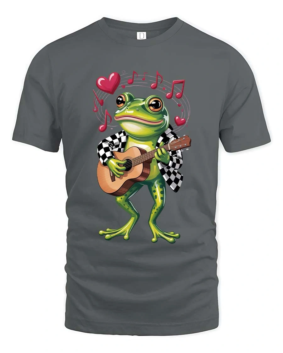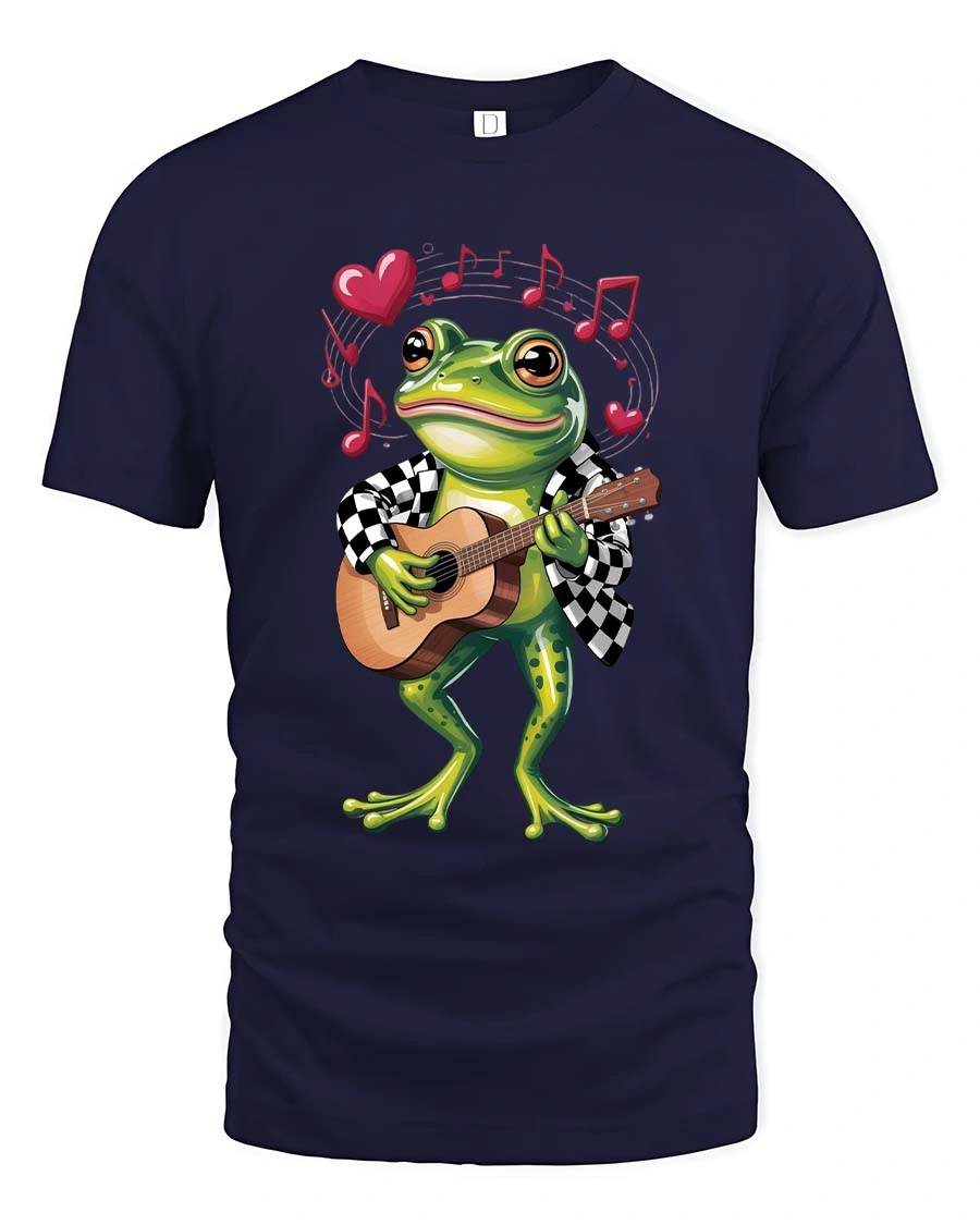 Featuring an adorable frog playing a guitar surrounded by musical notes and hearts, this tshirt captures a fun and lively atmosphere full of positive energy.