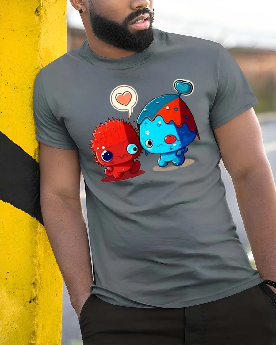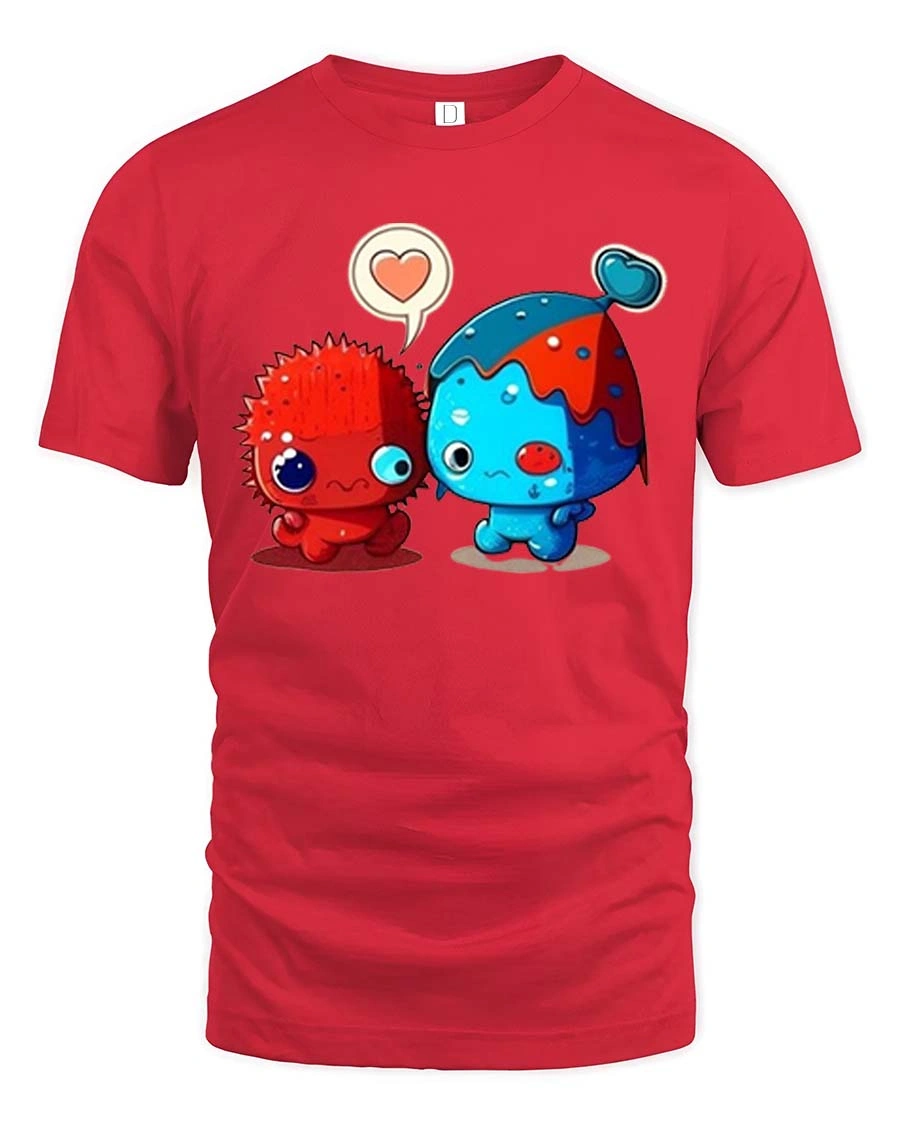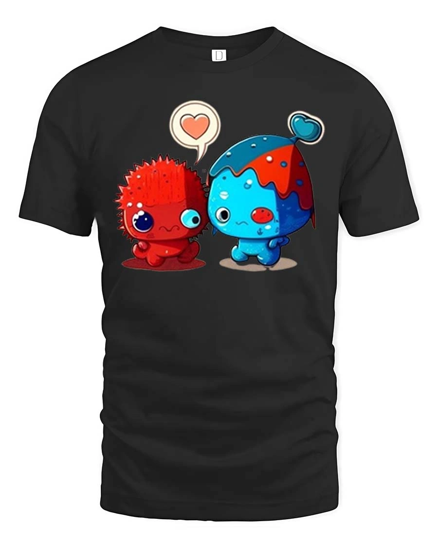 Adorable Monster Love Pair Cartoon Style Graphic T Shirt Tee captures a heartwarming and playful moment between two adorable characters.