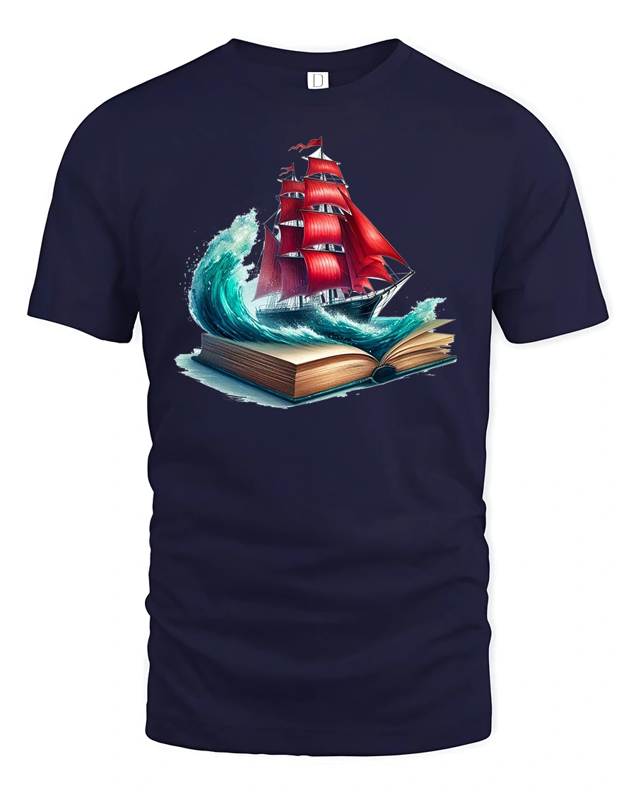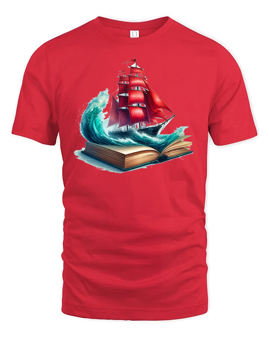 Step into a world of imagination with the Adventure Awaits Red Sail Ship Book Graphic T-Shirt. This unique design features a powerful ship with bold red sails rising from the pages of an open book, riding a wave of creativity and adventure. Perfect for dreamers, readers, and ocean lovers, this tee celebrates the magic of stories that take us beyond the horizon.