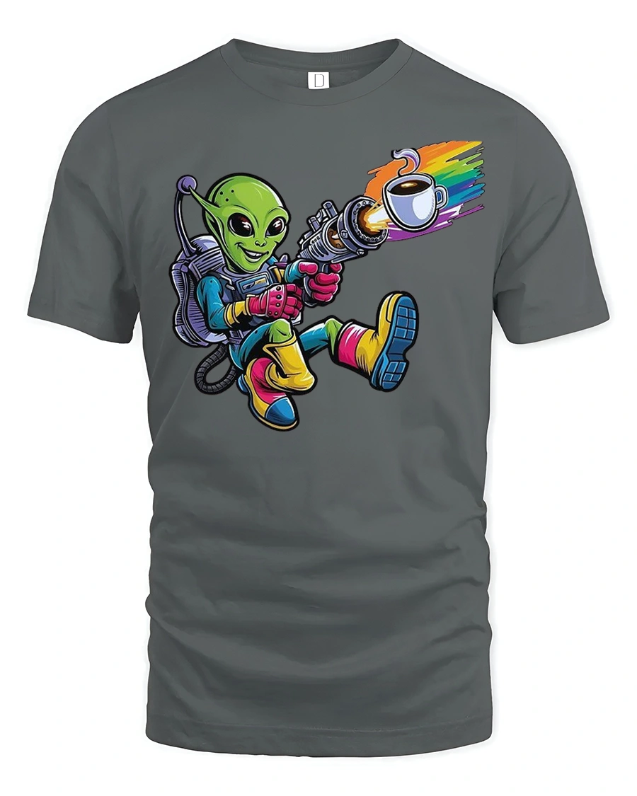 Fuel your day with a cosmic twist in the Alien Coffee Blaster Funny Space Barista T-Shirt. This hilarious and colorful design features a quirky green alien shooting coffee from a high-tech blaster, making it the perfect gift for coffee addicts, sci-fi fans, and humor lovers alike. The rainbow coffee blast adds a vibrant pop that’s sure to get noticed.