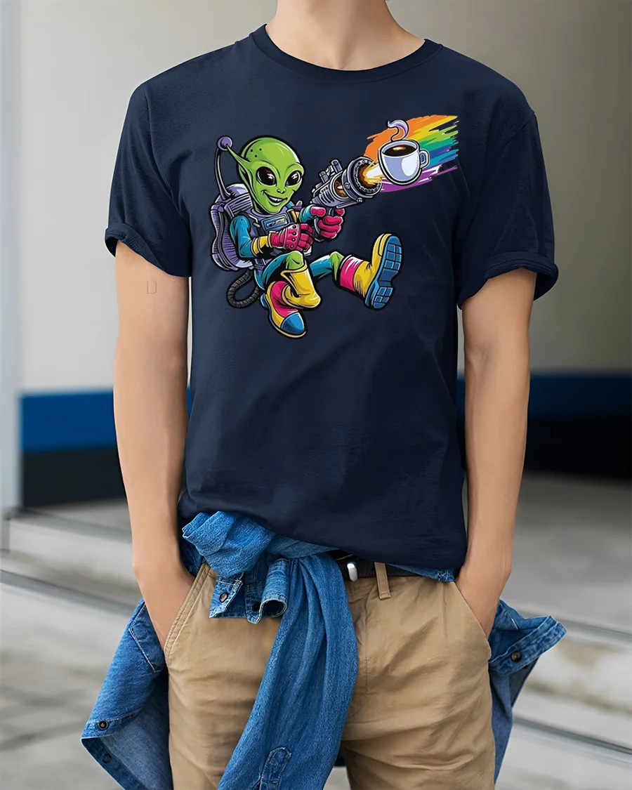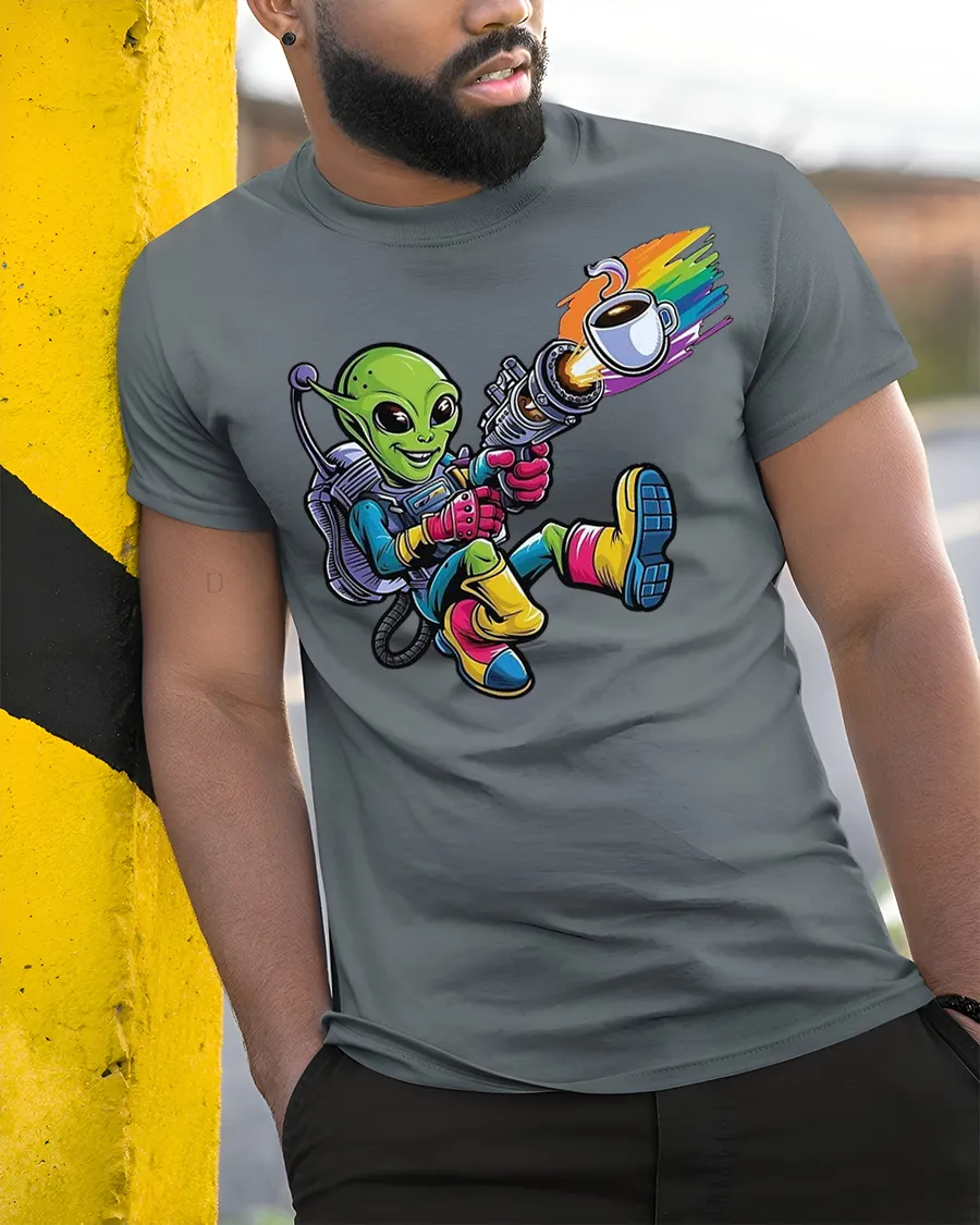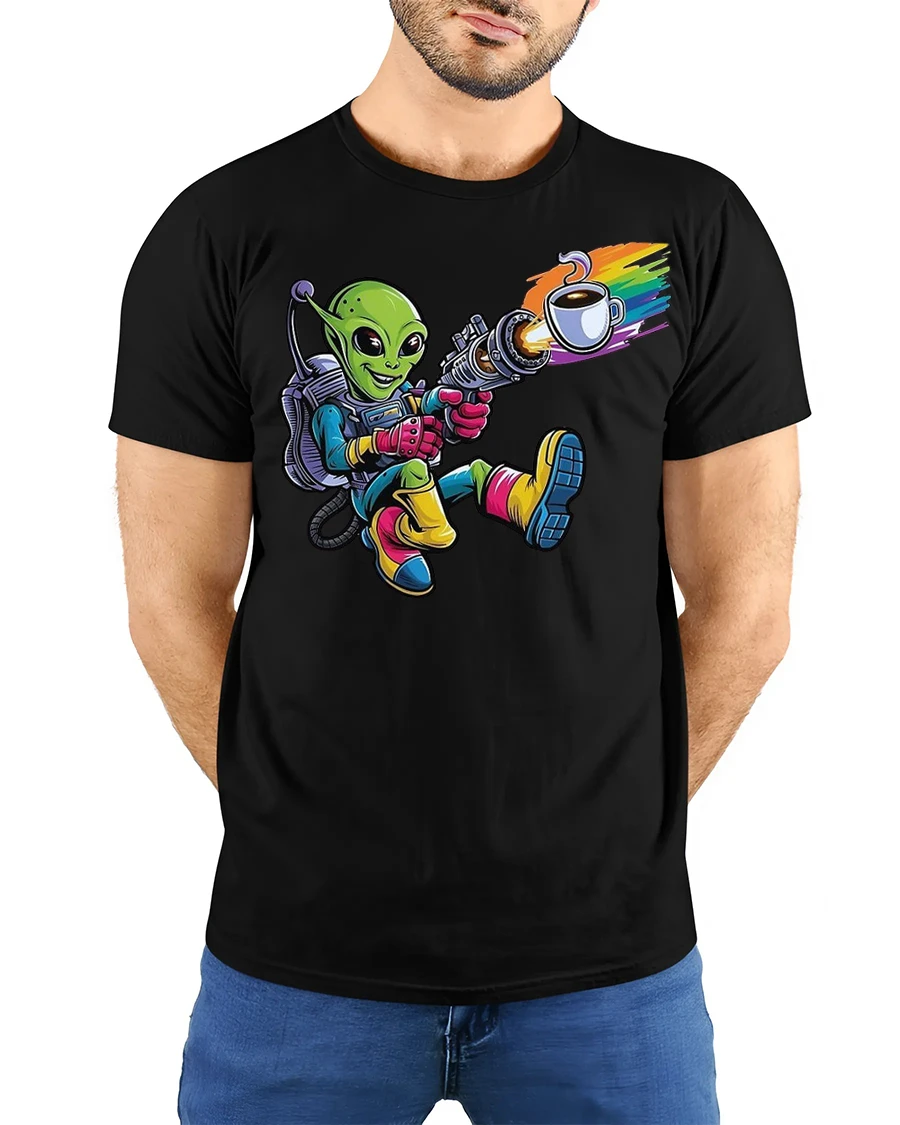 Made with high-quality, soft cotton fabric, this tee ensures lasting comfort for everyday wear. The detailed artwork is printed with premium inks, keeping the bold colors bright and crisp even after multiple washes. Whether you’re sipping your morning brew, attending a comic con, or just showing off your love for caffeine and aliens, this shirt is guaranteed to spark conversation.