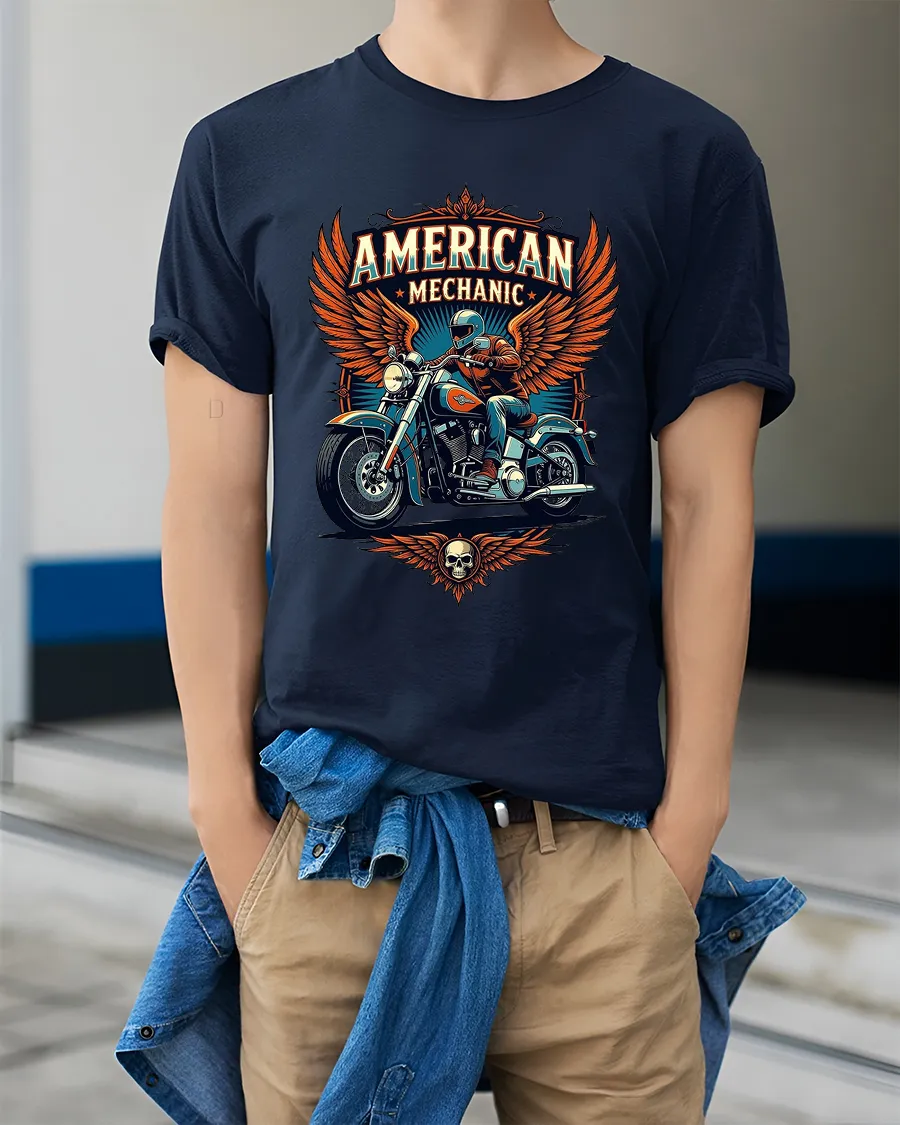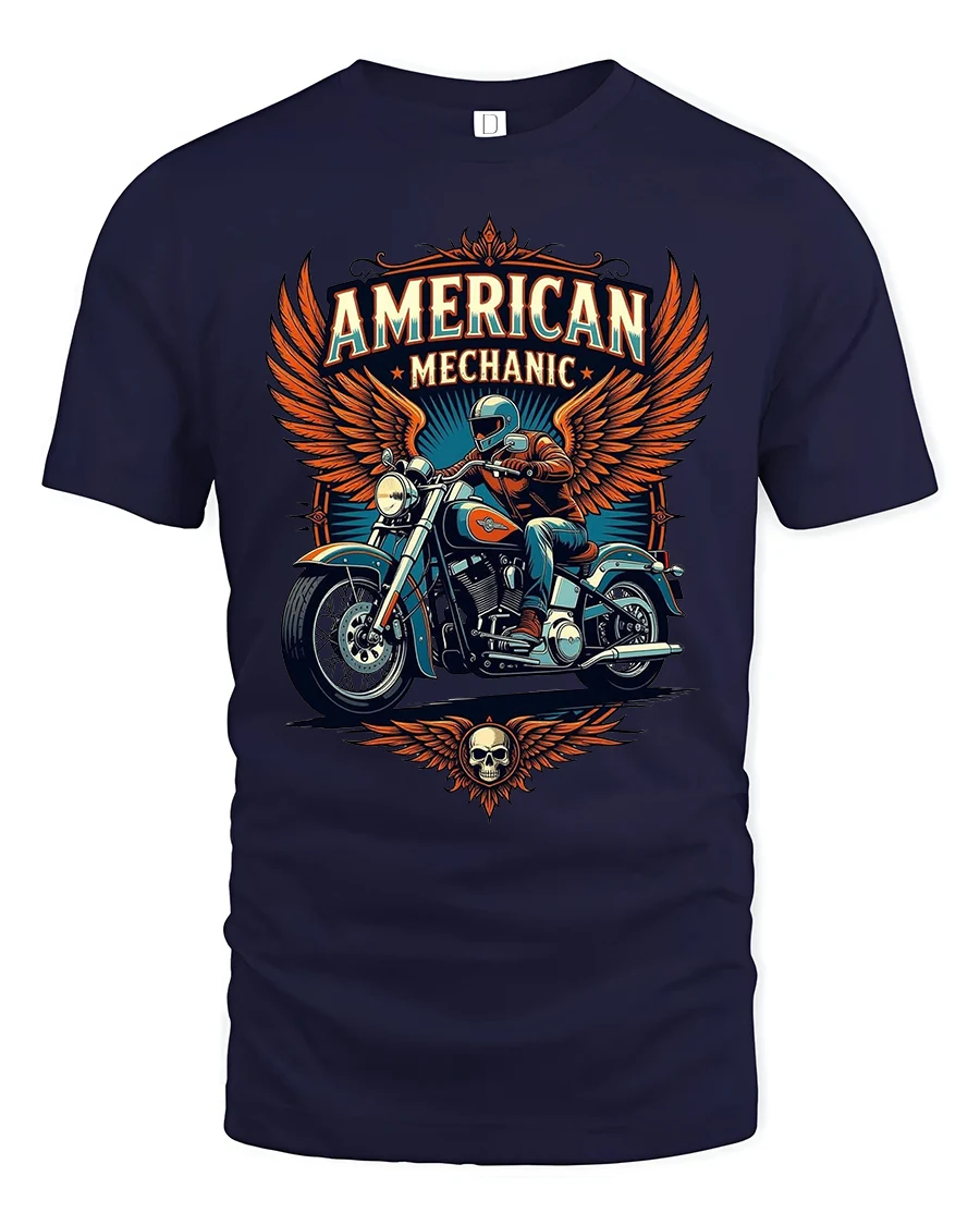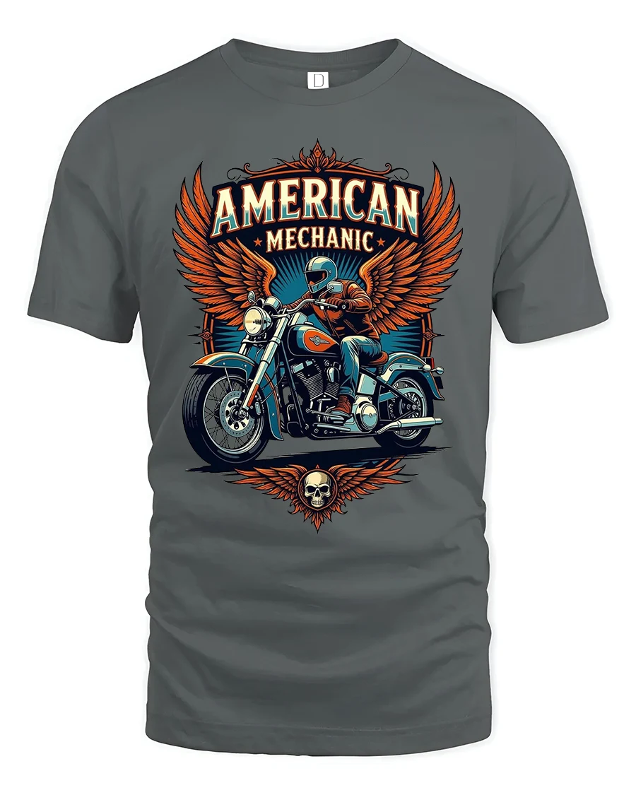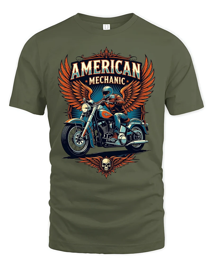 American Mechanic Motorcycle Graphic T Shirt With Classic Biker Pride captures the spirit of freedom craftsmanship and the open road in a bold iconic design.