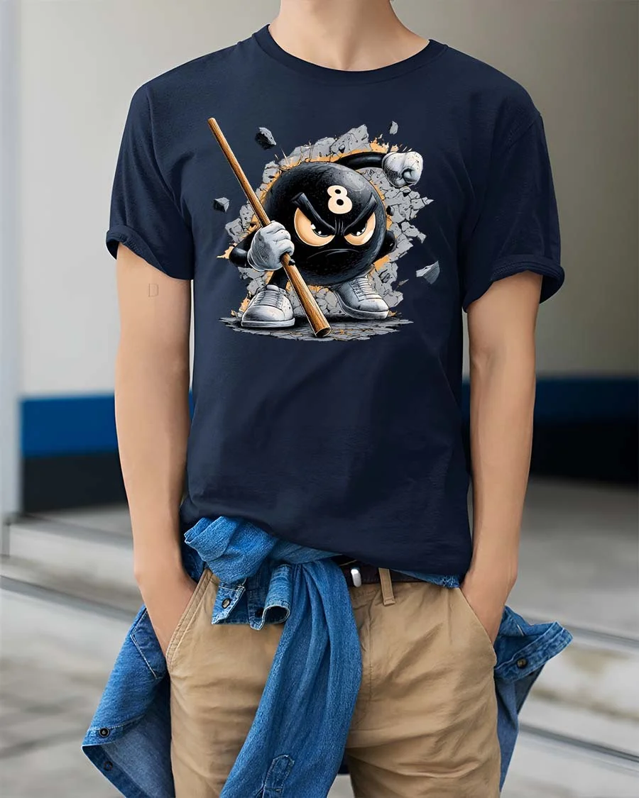 Angry 8 Ball Smash Graphic T-Shirt Pool Player Attitude Tee - model wearing navy tee with hands in pockets