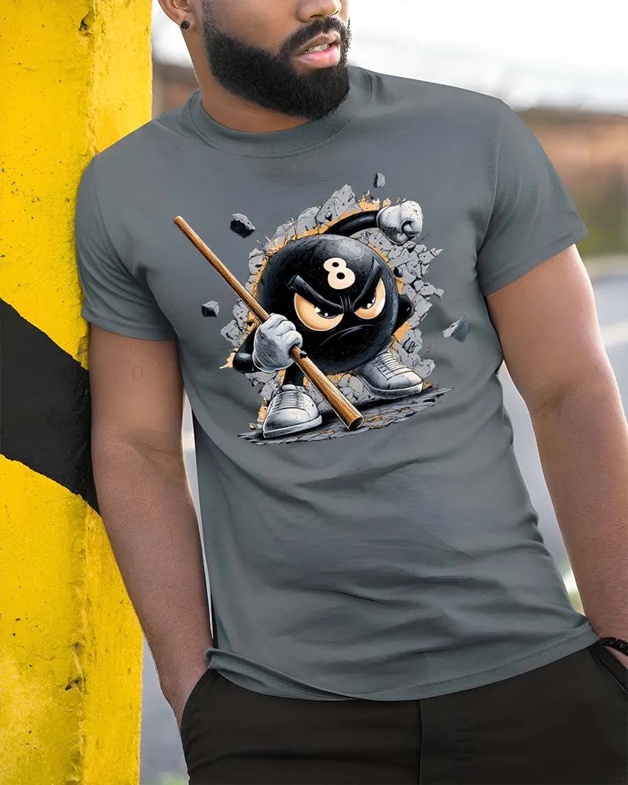 Angry 8 Ball Smash Graphic T-Shirt Pool Player Attitude Tee - model wearing grey tee, leaning on column