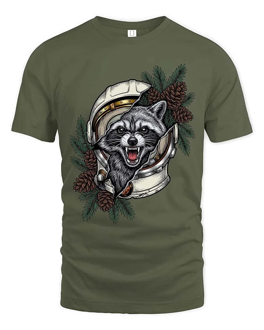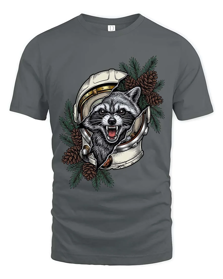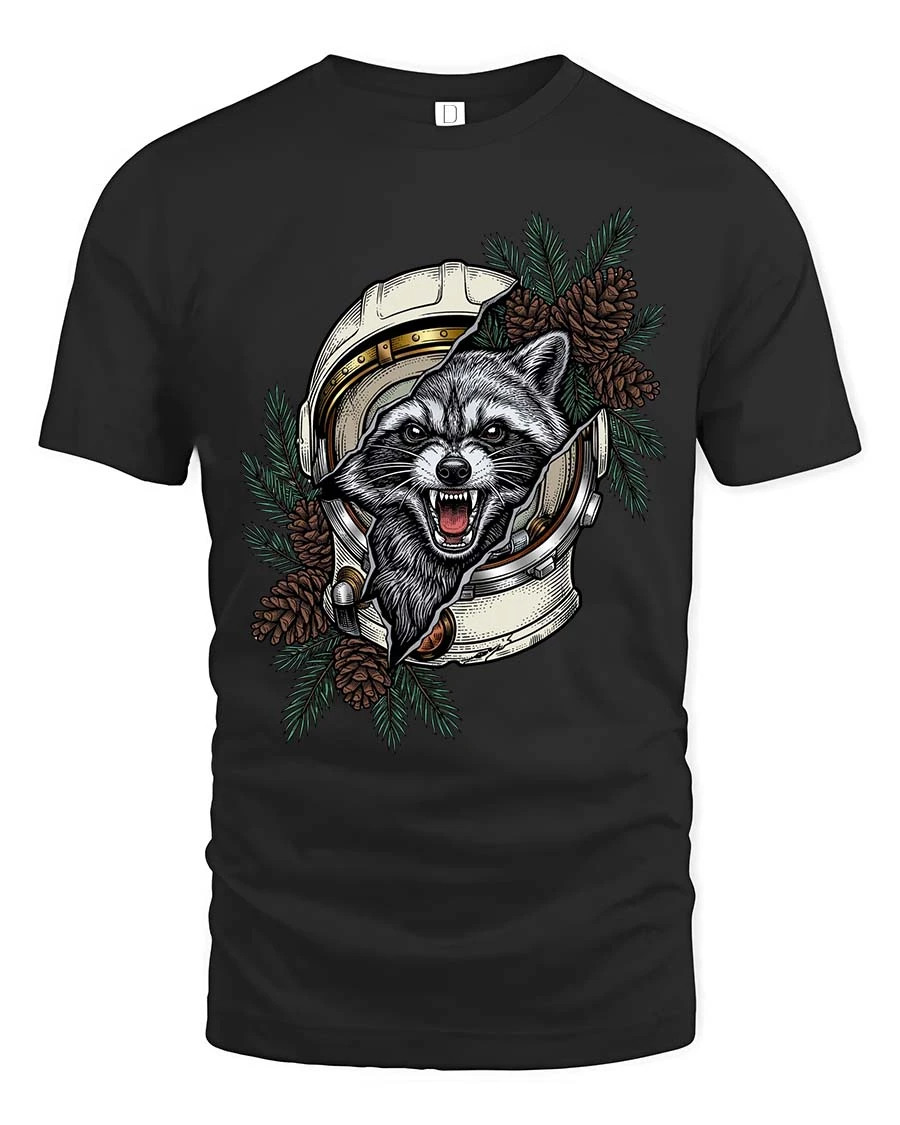 This unique design features a fierce raccoon bursting through a space helmet surrounded by natural elements, creating a striking contrast between wild nature and futuristic adventure.