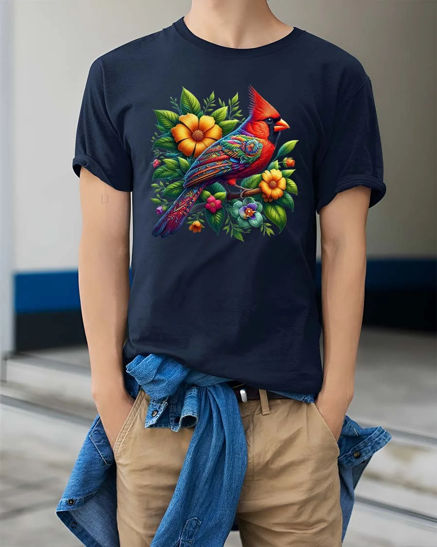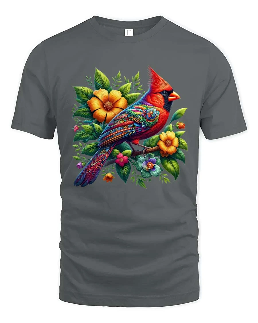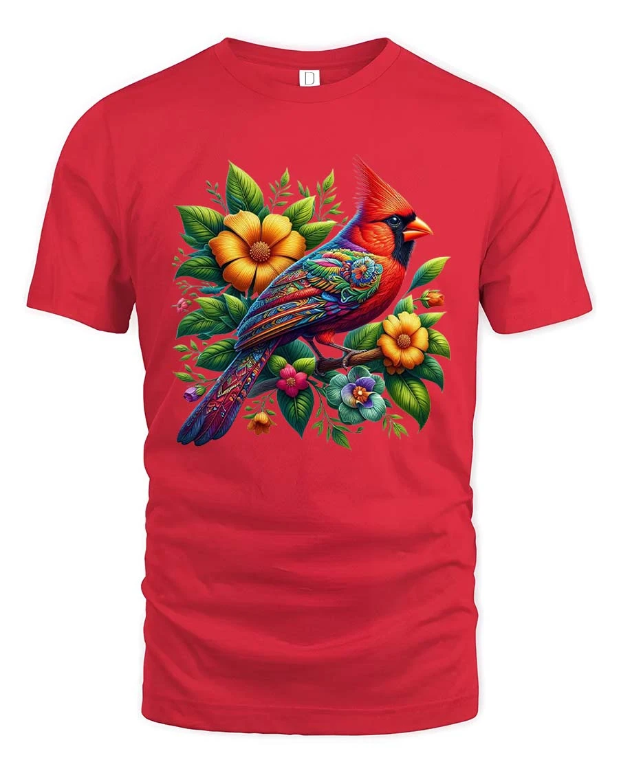 Artistic Cardinal Bird T Shirt Bright Flower Nature Design Tee features a stunning red cardinal surrounded by vibrant flowers and lush greenery.