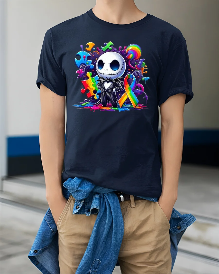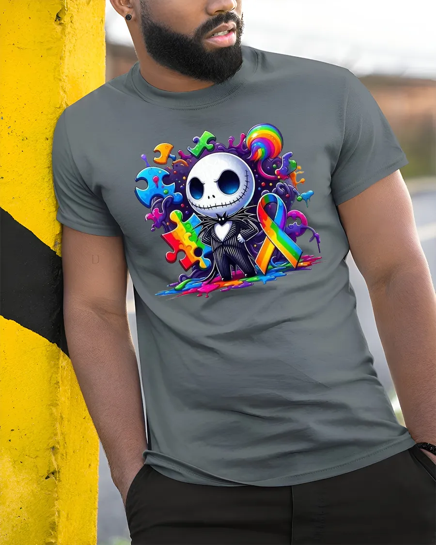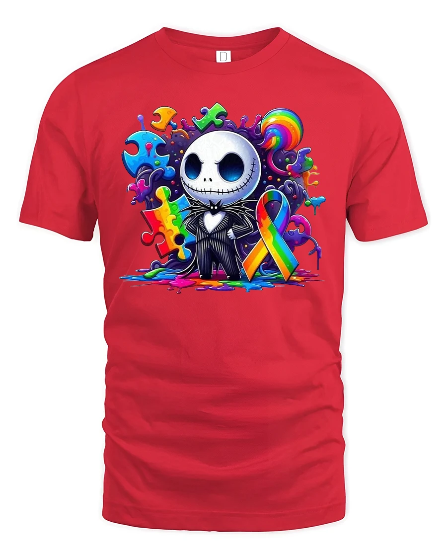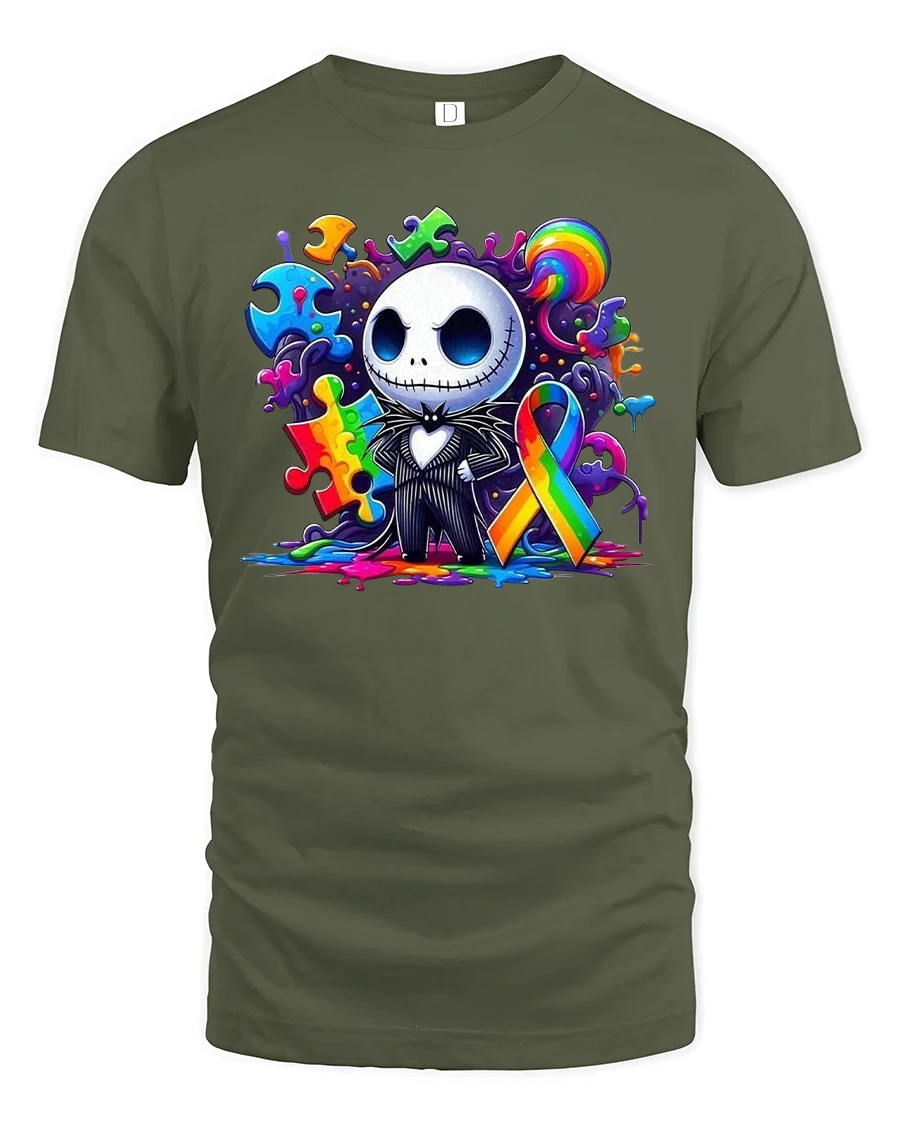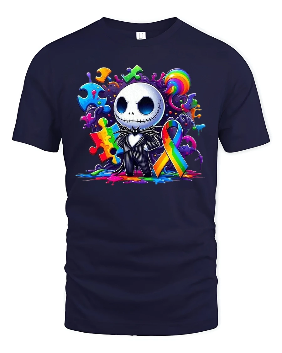 Featuring a unique skeleton character surrounded by vibrant puzzle pieces and a bright rainbow ribbon, this design celebrates diversity, creativity, and individuality in a fun, artistic style.