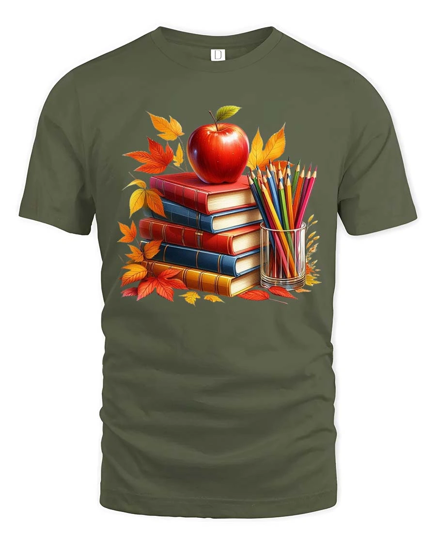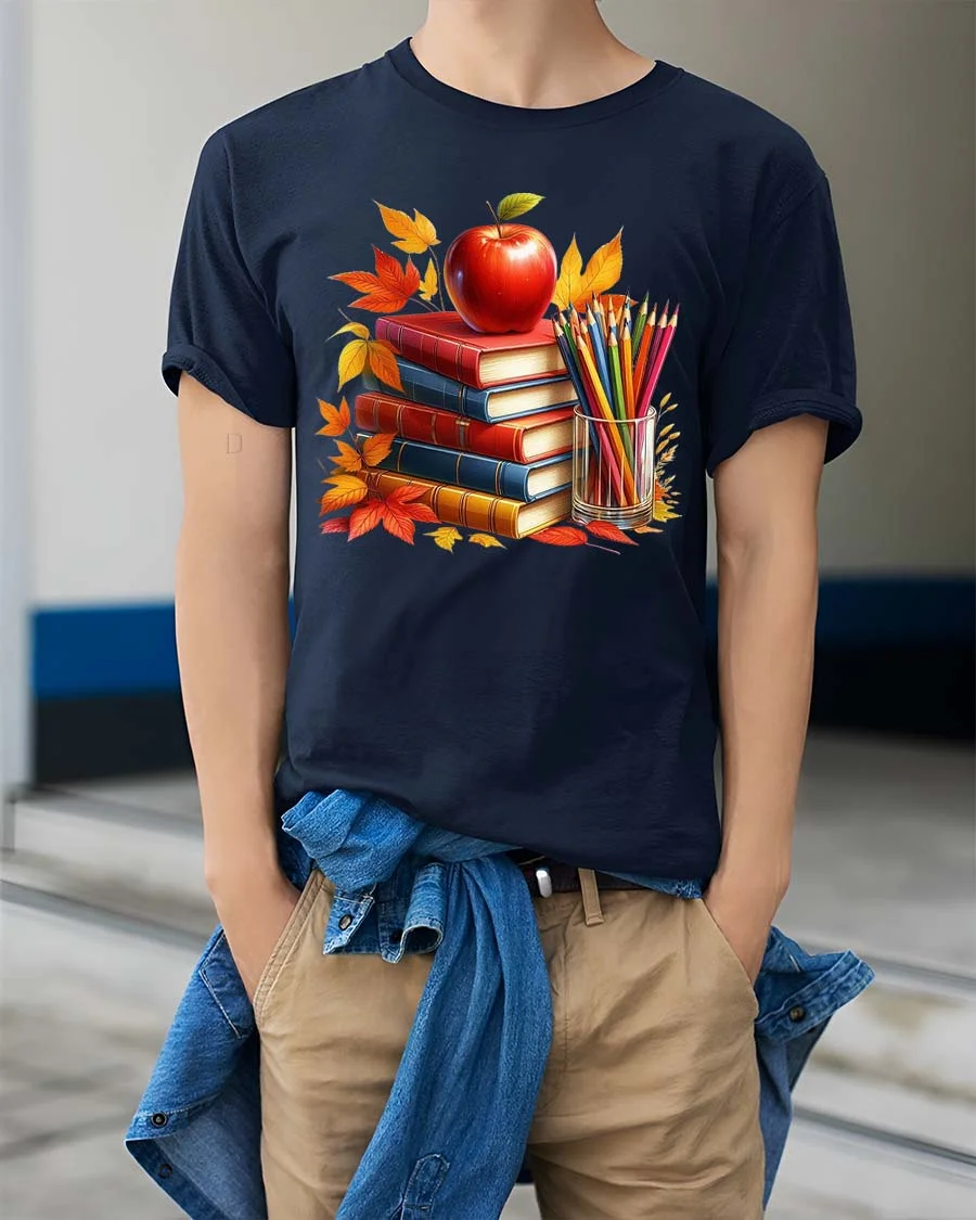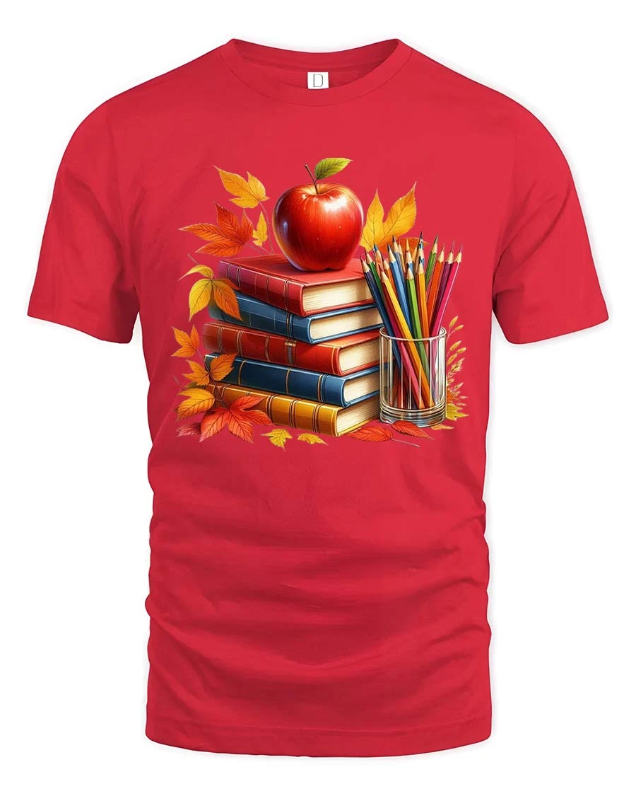 Autumn Books Apple Teacher Classroom Art Style tshirt is a perfect choice for educators and book lovers alike.