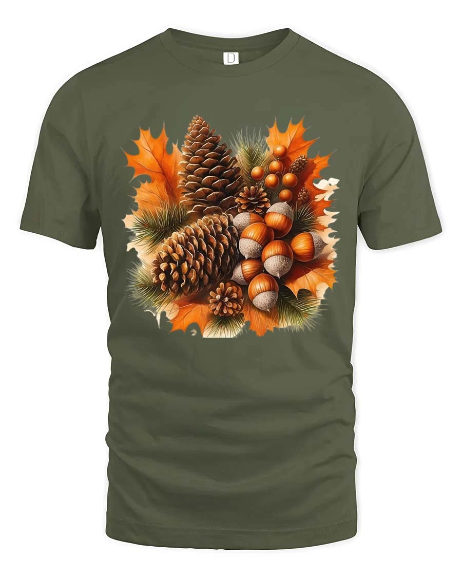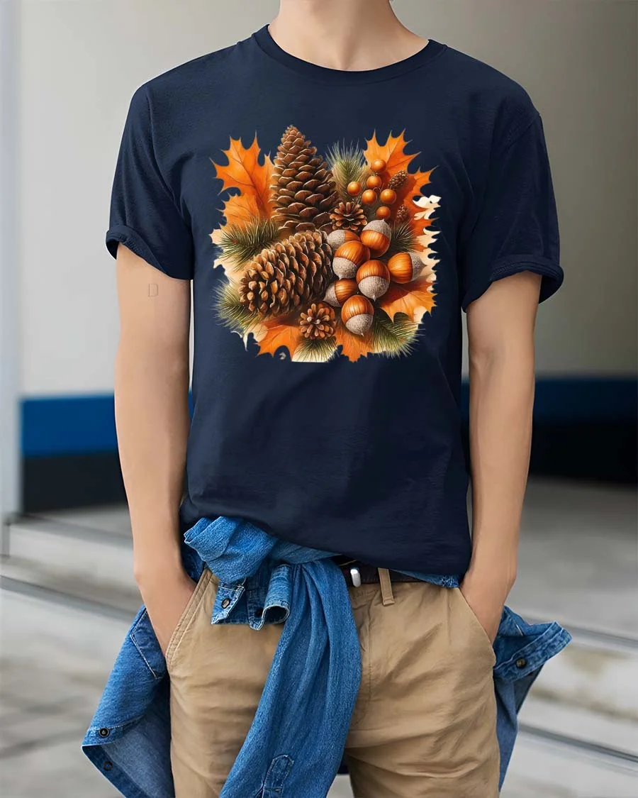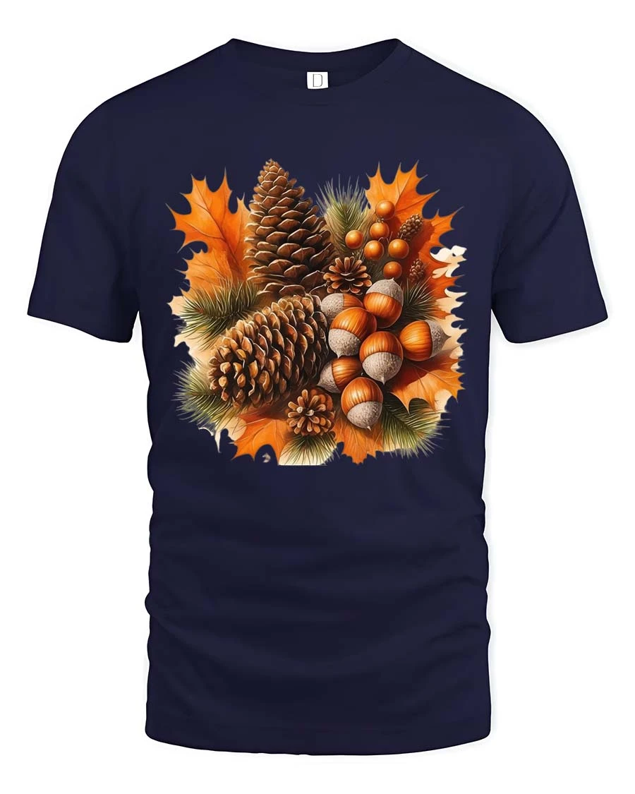 Autumn Pinecone Acorn Leaves Graphic T-Shirt Fall Nature Tee captures the beauty of the fall season with a rich and detailed natural design.