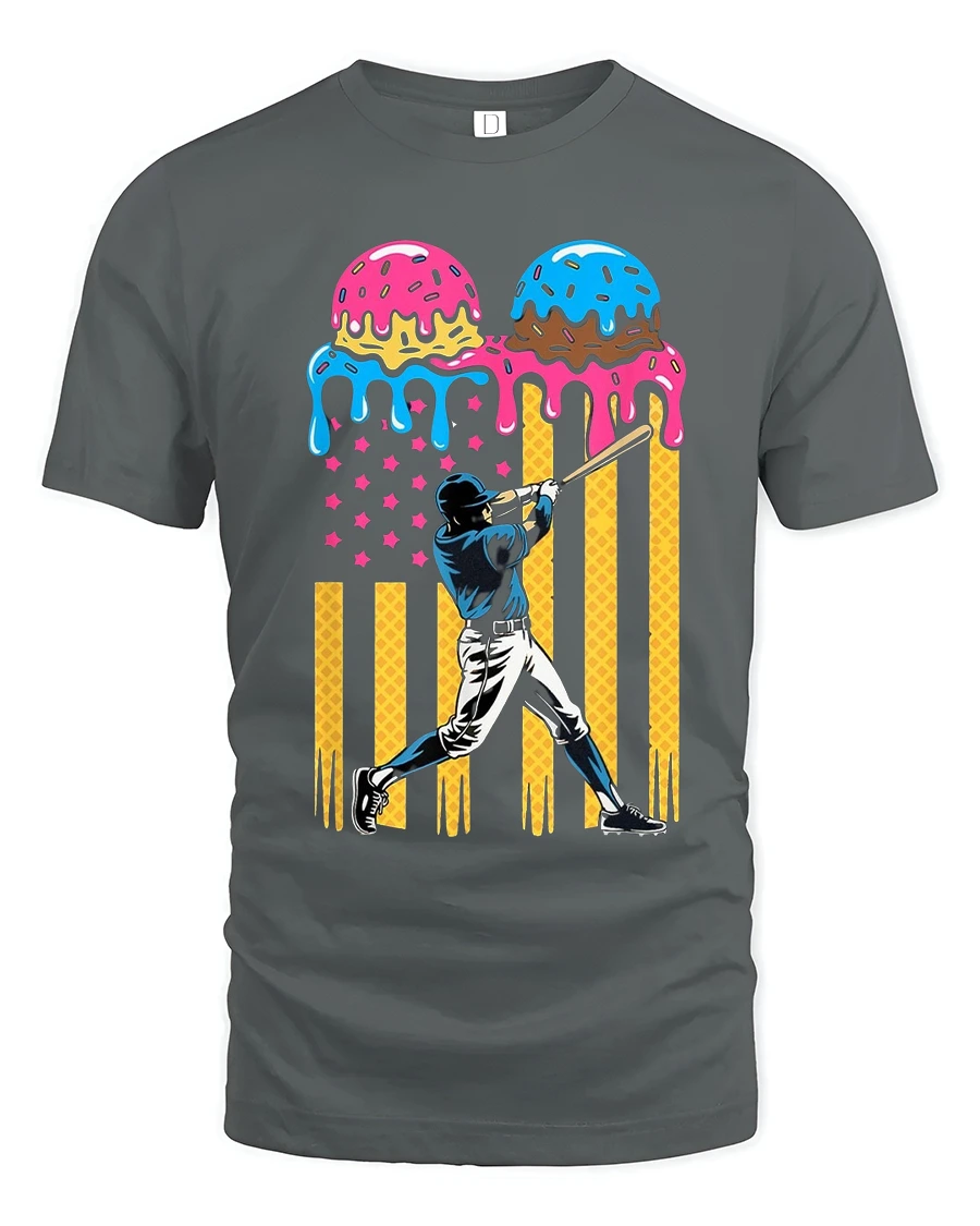 The design blends a powerful baseball swing with dripping ice cream visuals layered over a bold flag inspired background.