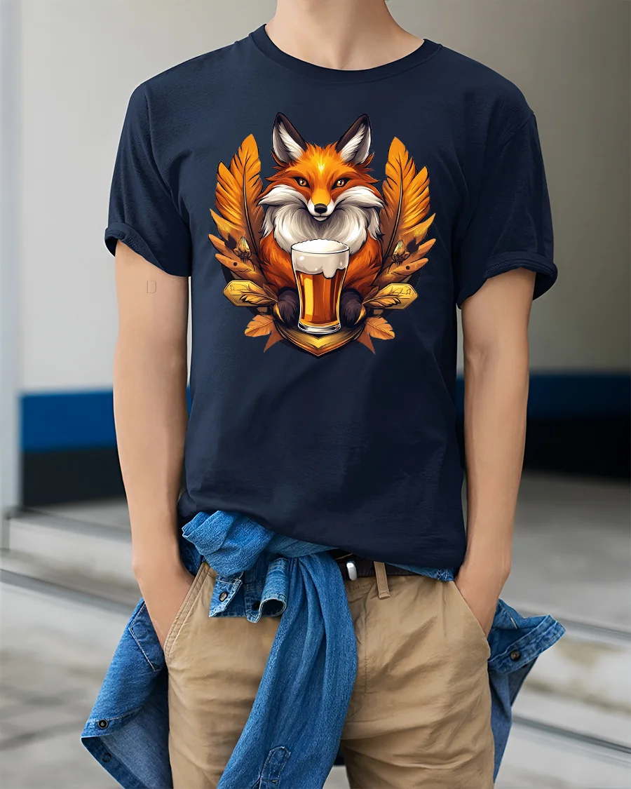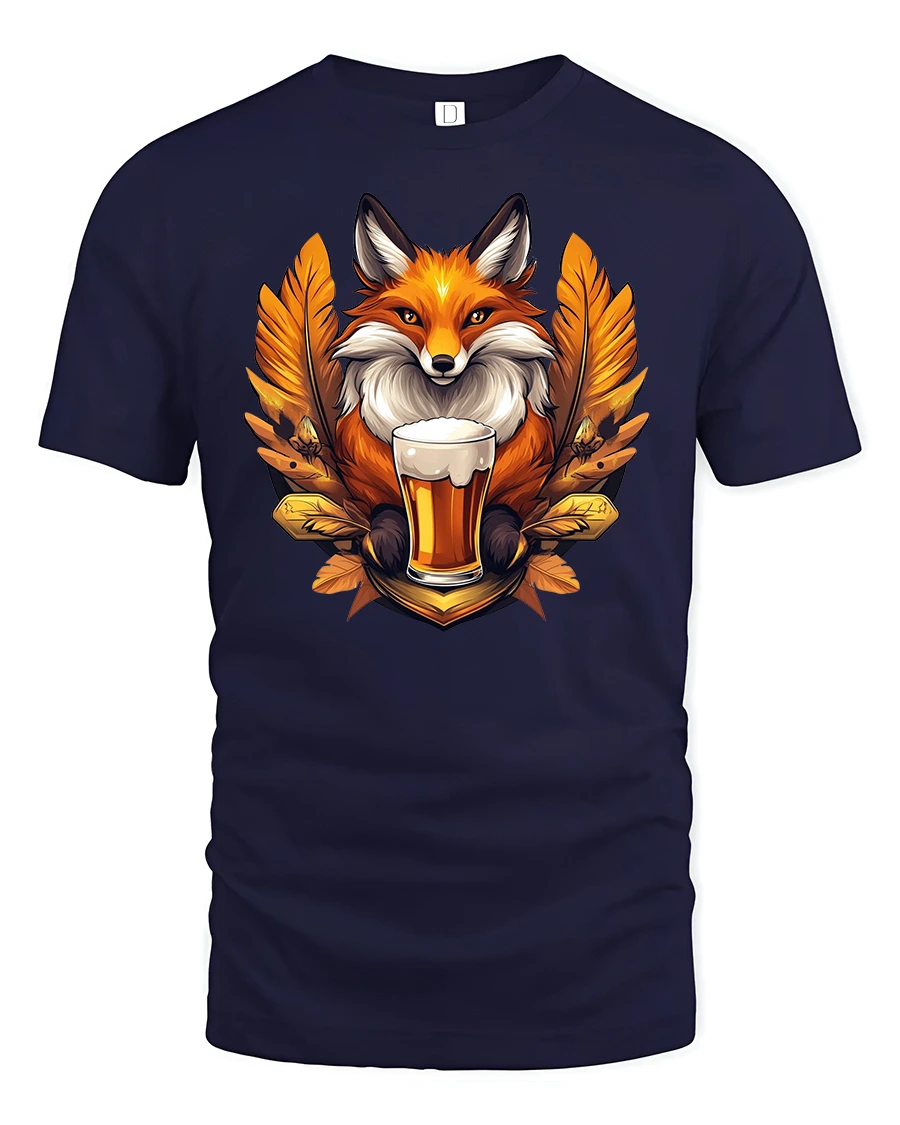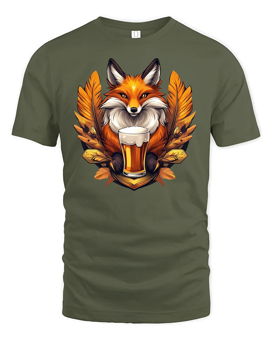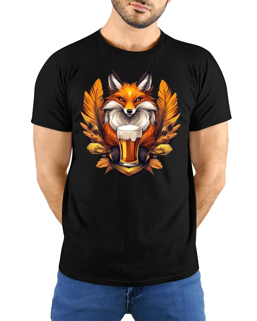 Featuring a cheerful fox holding a frothy mug of beer surrounded by autumn leaves, this tee adds fun and warmth to any outfit.