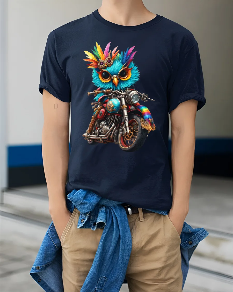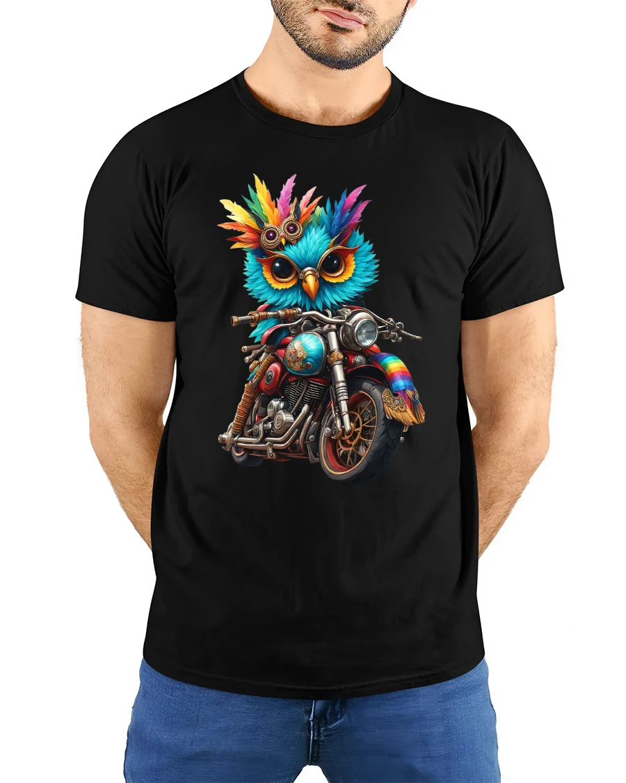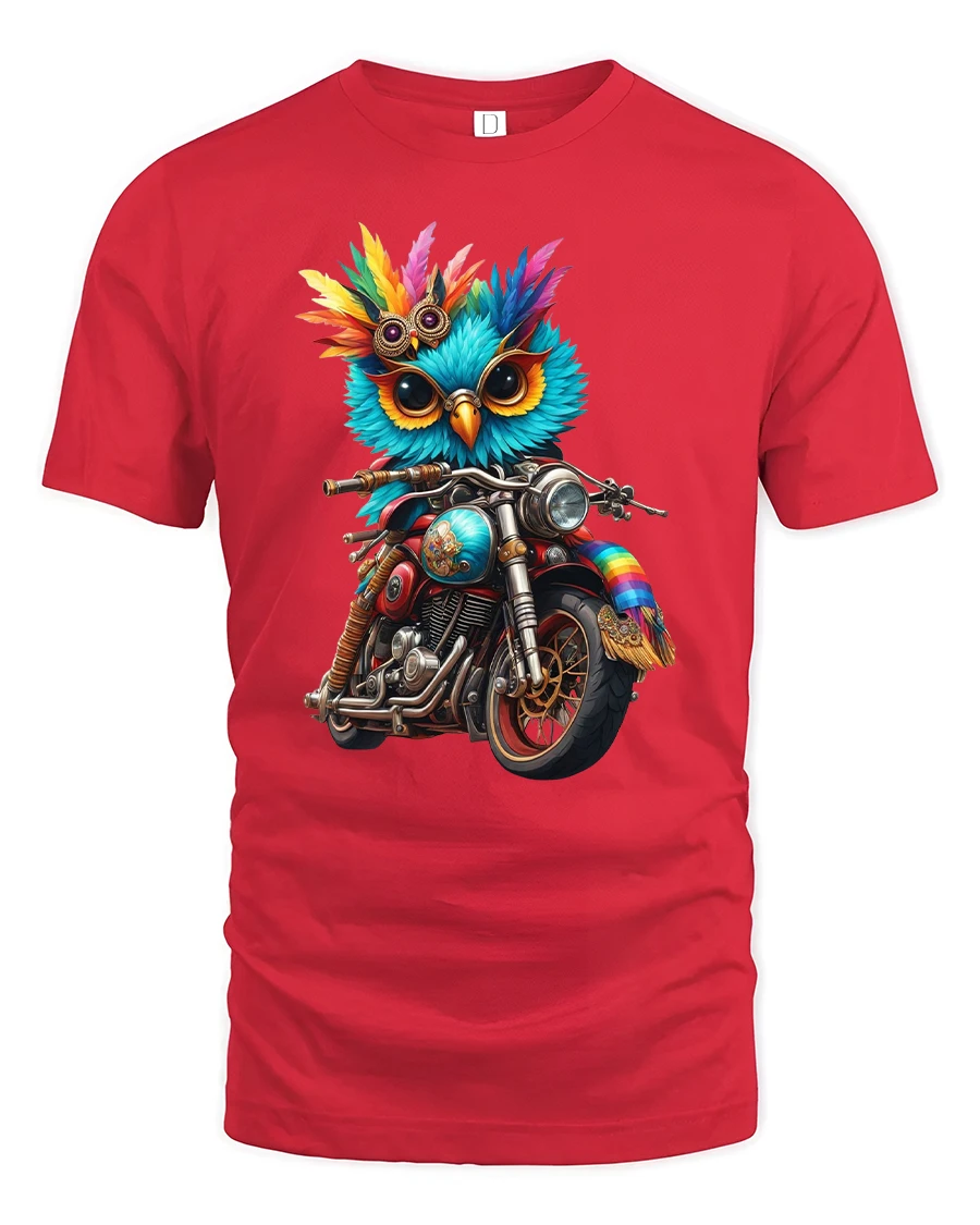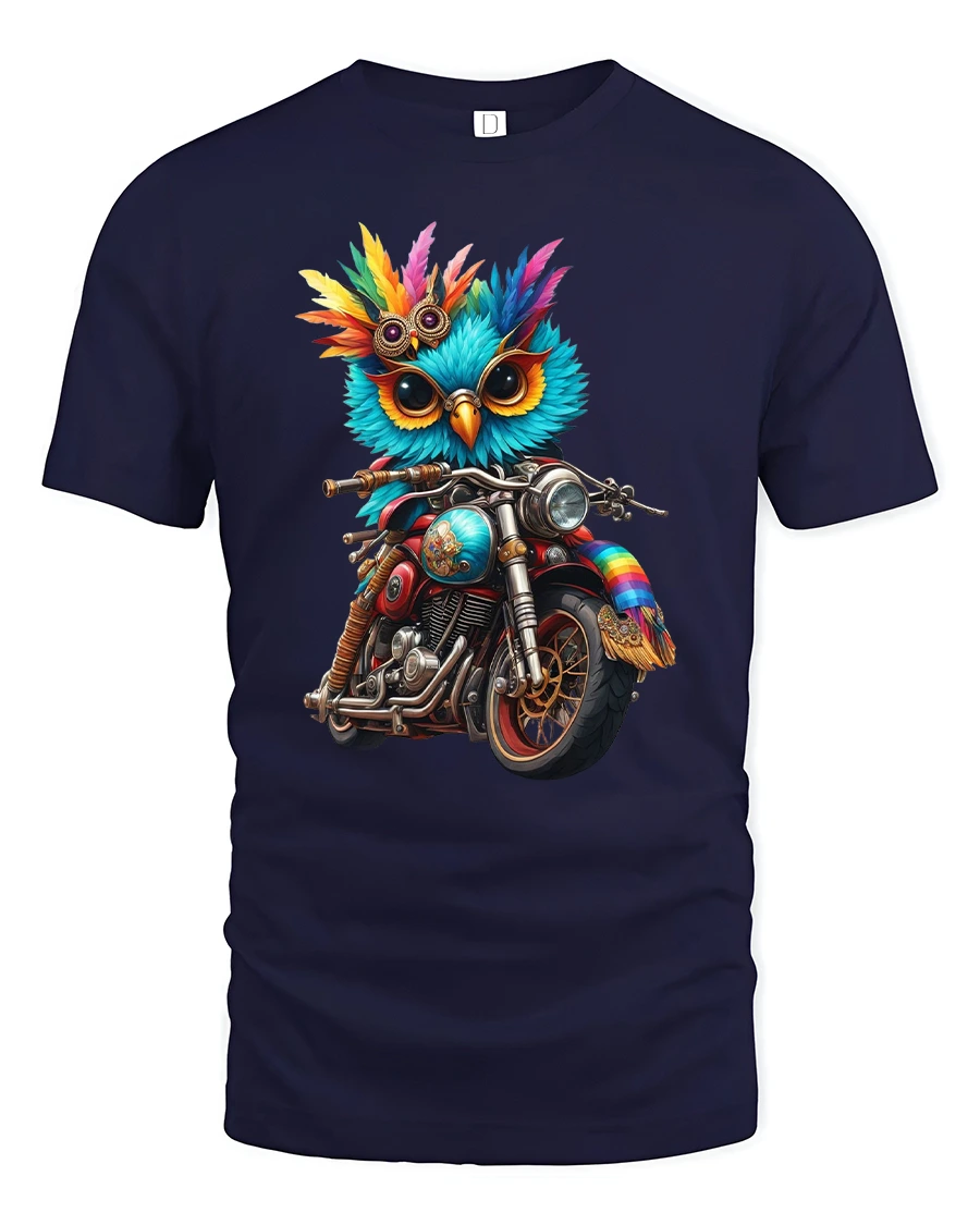 Featuring a colorful owl rocking shades and riding a classic motorcycle, this design perfectly captures the spirit of freedom and adventure — with a quirky twist.