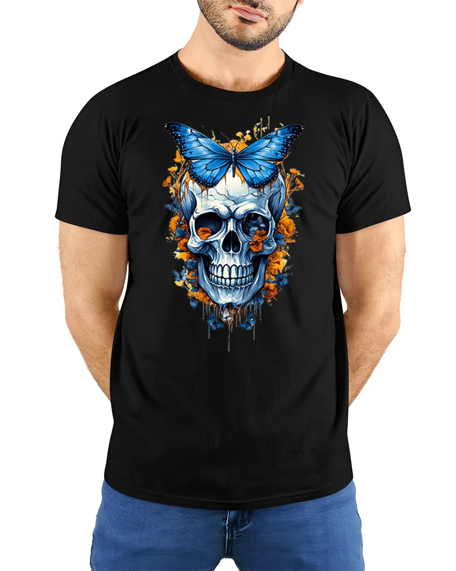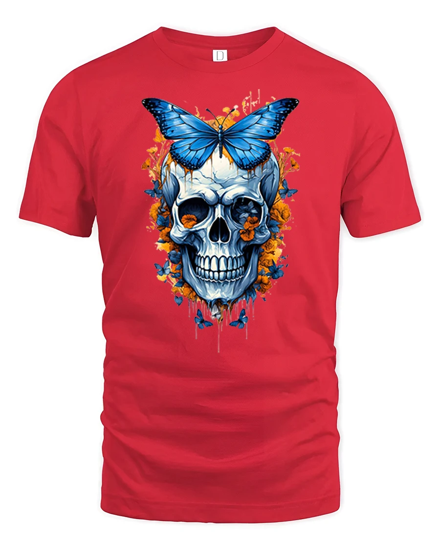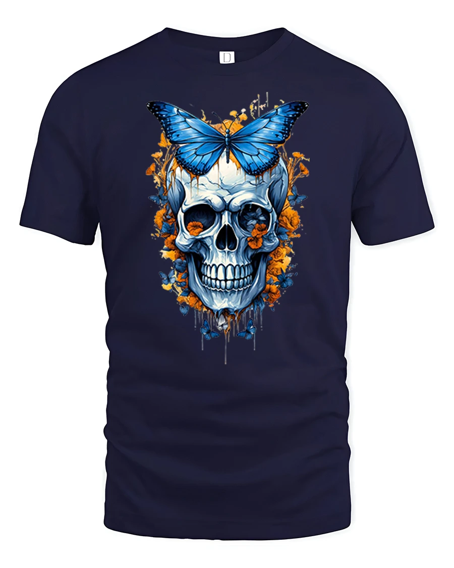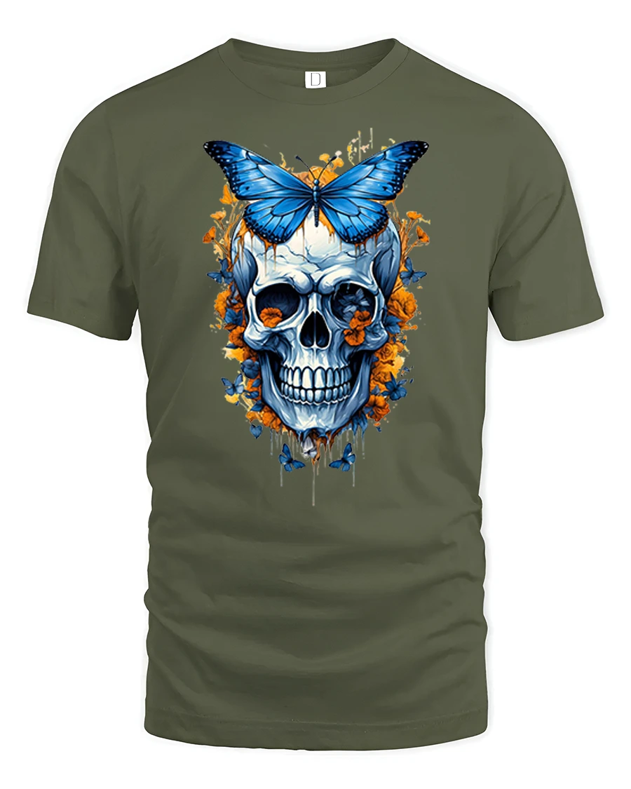 Blue Butterfly Skull Floral Art Graphic Tshirt Dark Fantasy Style blends beauty and mystery into one striking design.