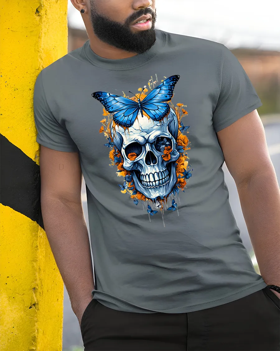 Blue Butterfly Skull Floral Art Graphic Tshirt Dark Fantasy Style delivers a confident and edgy aesthetic that feels modern and timeless.