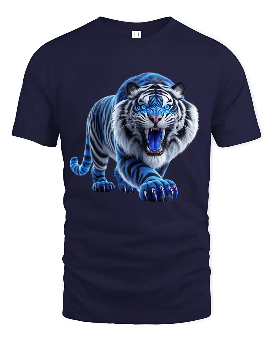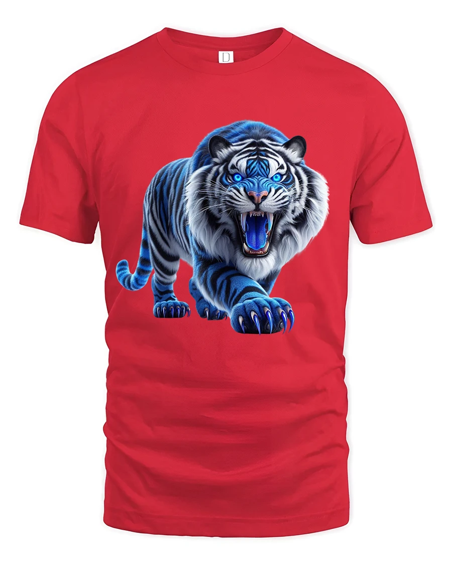 Blue Flame Tiger Roaring Graphic T Shirt captures raw power and intensity with a stunning blue themed predator design. Featuring a fierce tiger mid roar with glowing blue accents and striking detail, this artwork creates an unforgettable visual impact. The dynamic pose and sharp features give the design a bold and fearless energy that stands out instantly.
