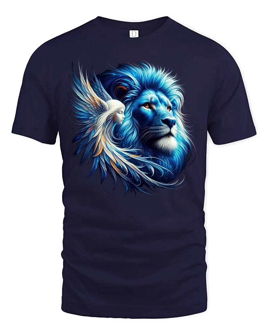 Elevate your style with our Blue Lion and Angel Tee. This captivating design features a regal blue lion with a calm yet powerful gaze, complemented by the ethereal figure of an angel with intricate feathered wings. The artwork blends strength and grace, creating a stunning visual statement that draws the eye and sparks conversation.