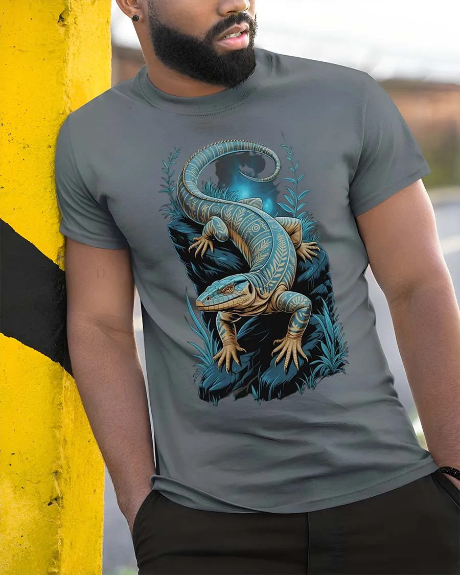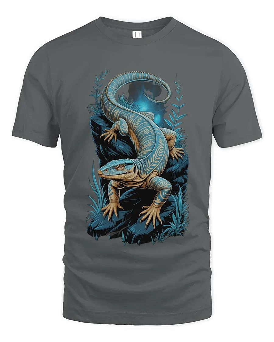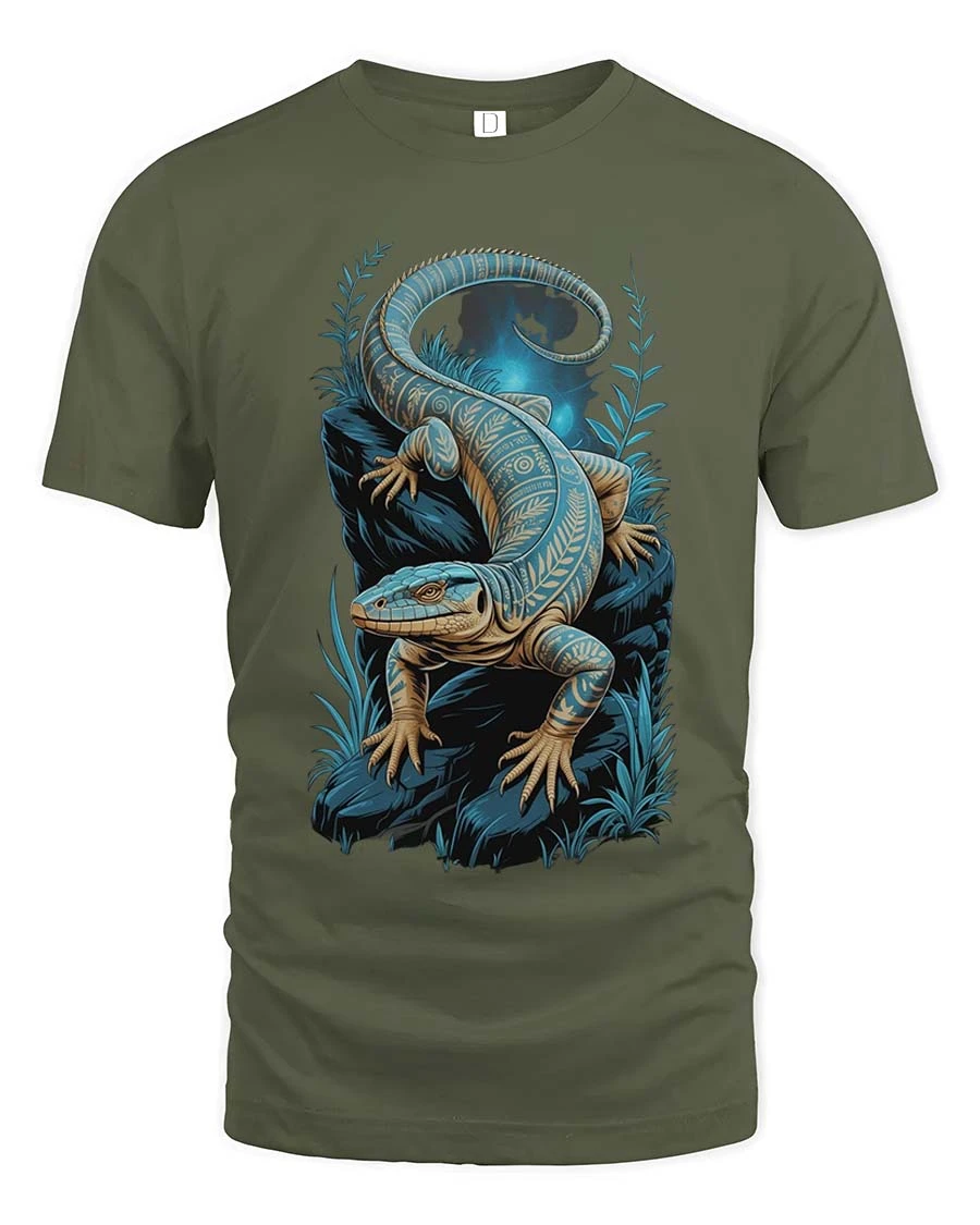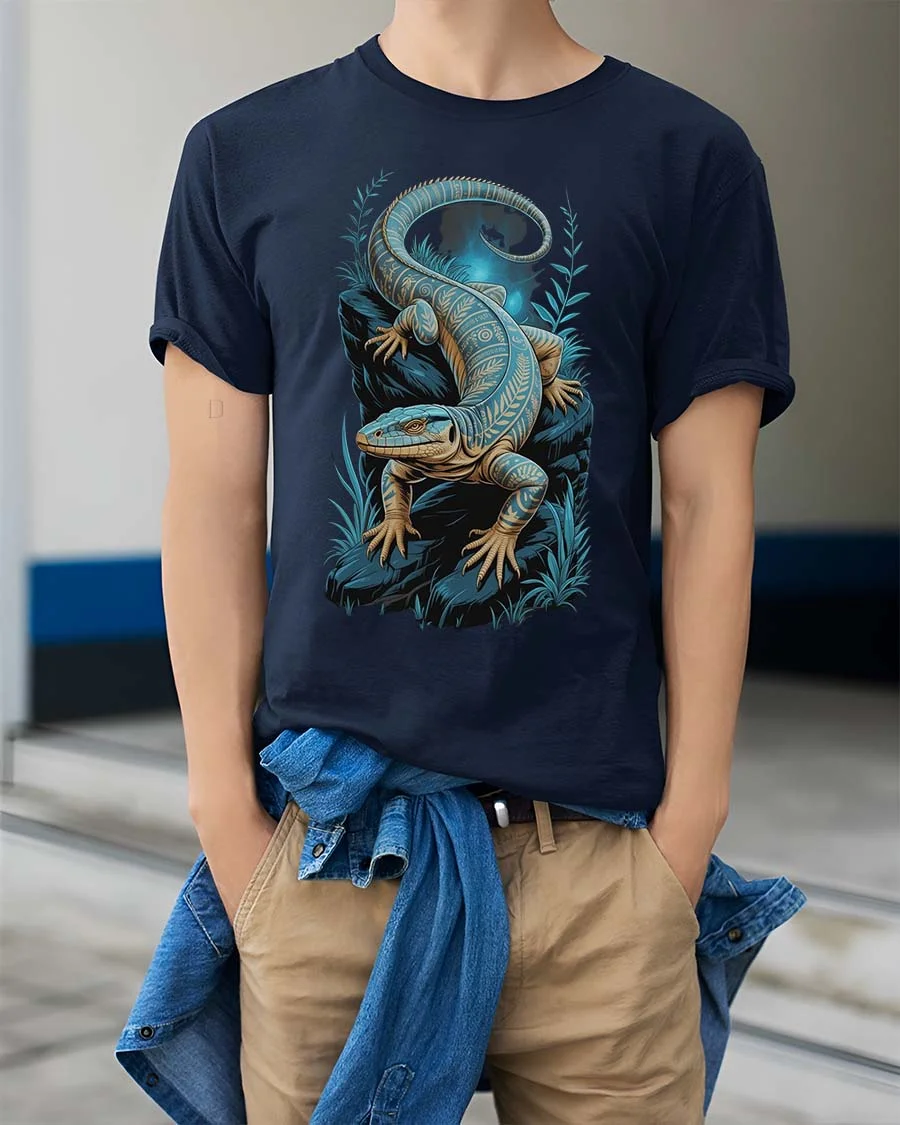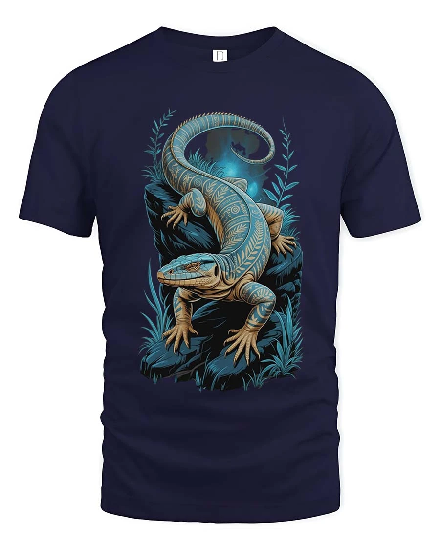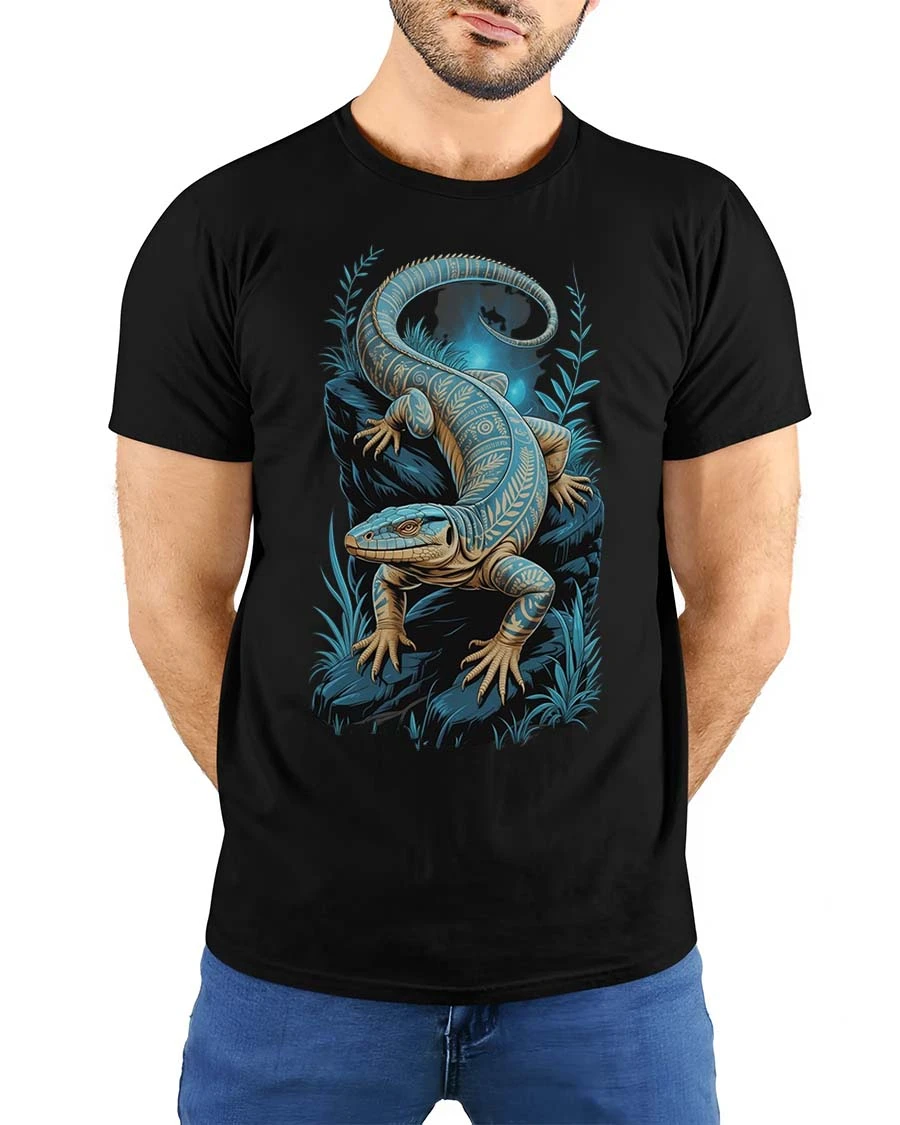 Blue Lizard Night Art T Shirt Mystical Reptile Graphic TeeBlue Lizard Night Art T Shirt Mystical Reptile Graphic Tee showcases a beautifully detailed reptile design surrounded by a calm and glowing night scene.