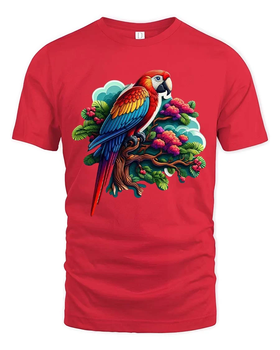 Bright Parrot Illustration T Shirt Tropical Style Graphic Tee - red t-shirt on white background
