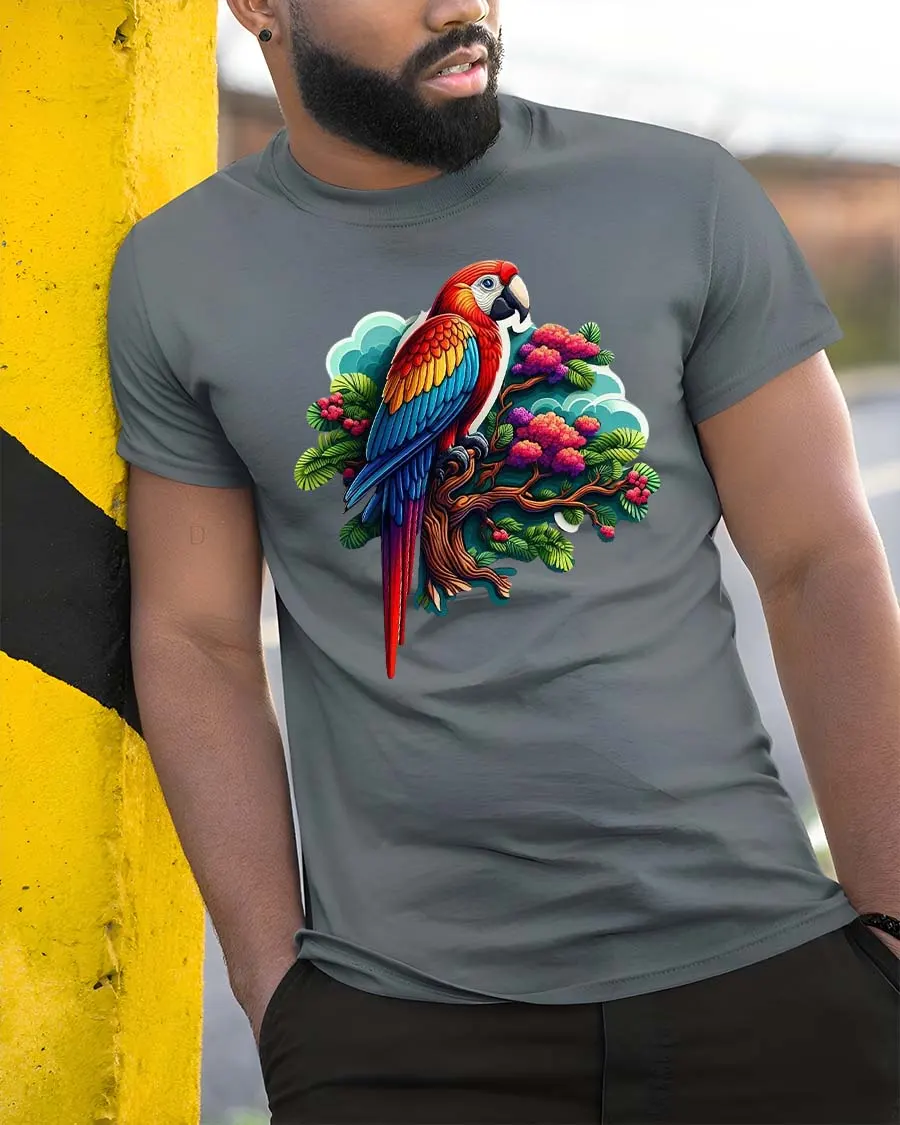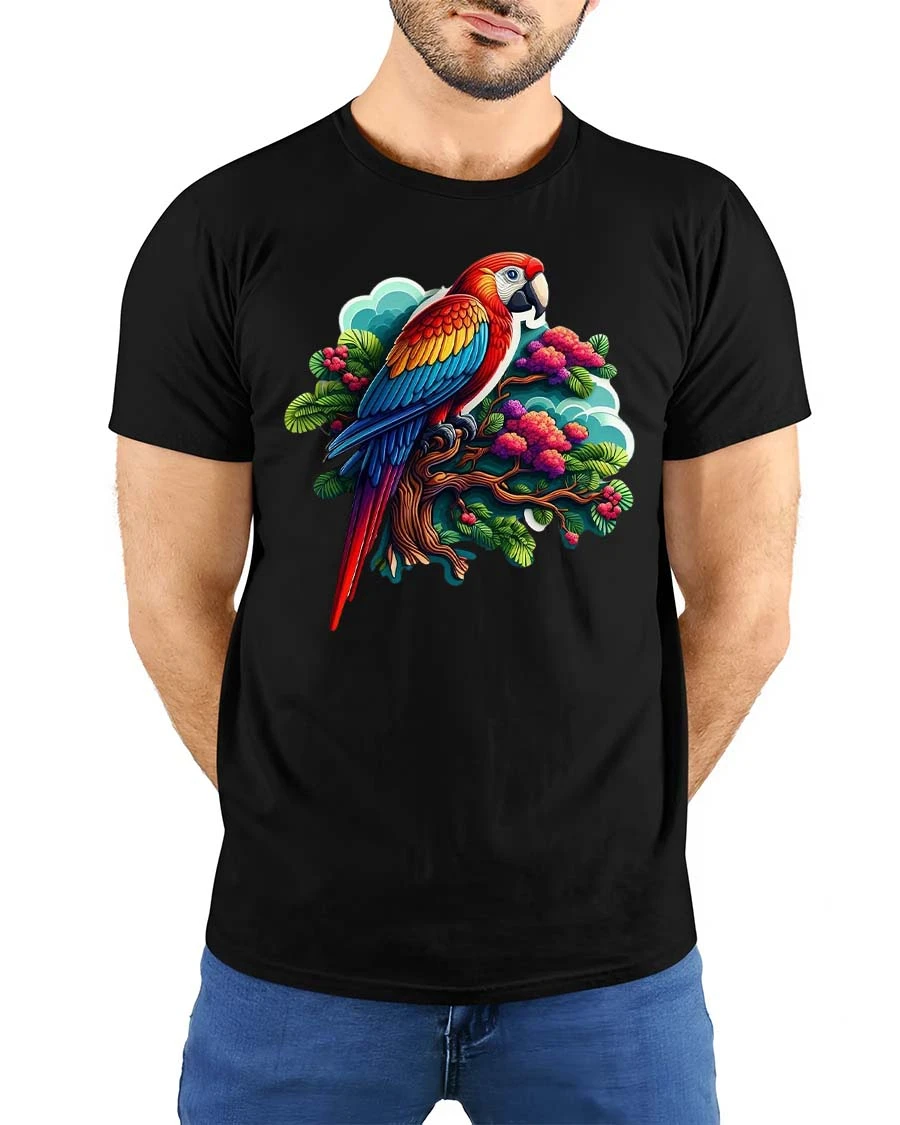 Bright Parrot Illustration T Shirt Tropical Style Graphic Tee features a beautifully detailed macaw perched on a branch surrounded by lush leaves and vibrant blossoms.