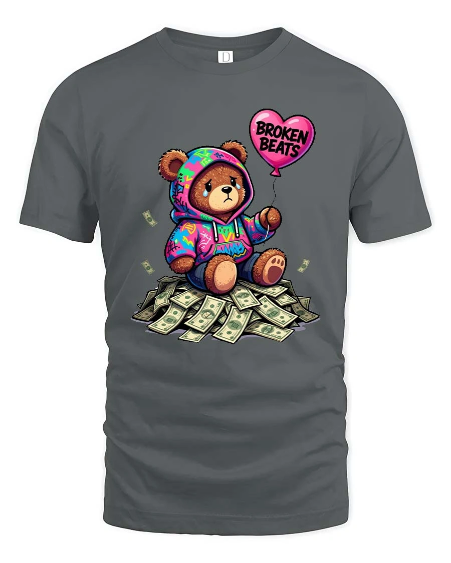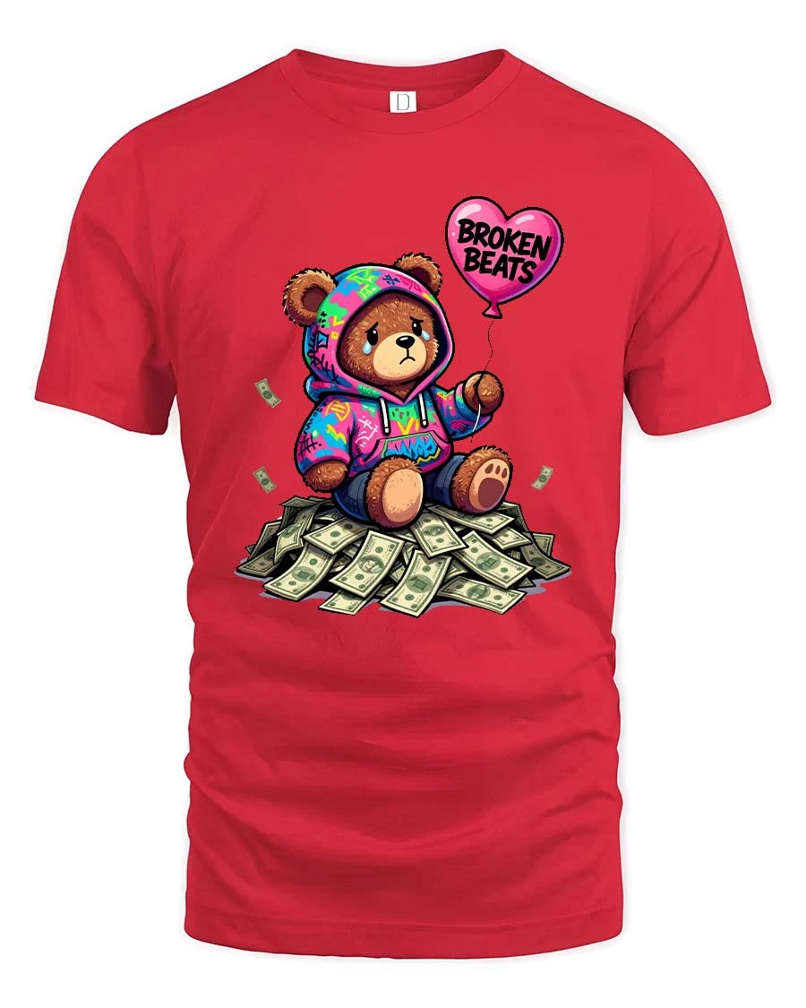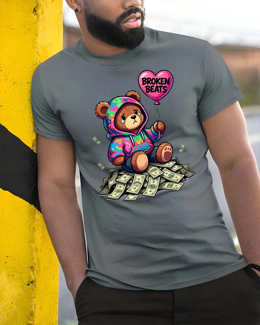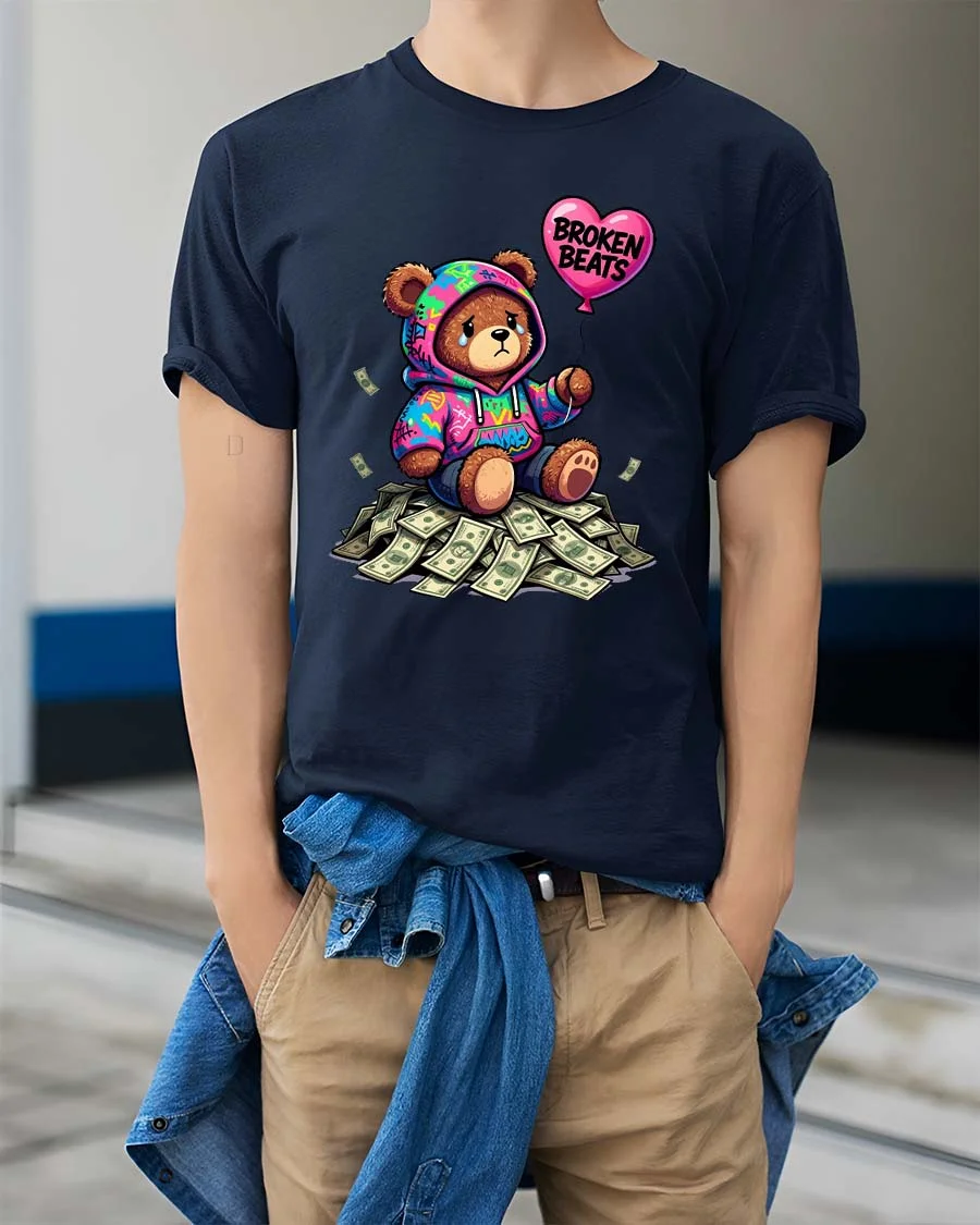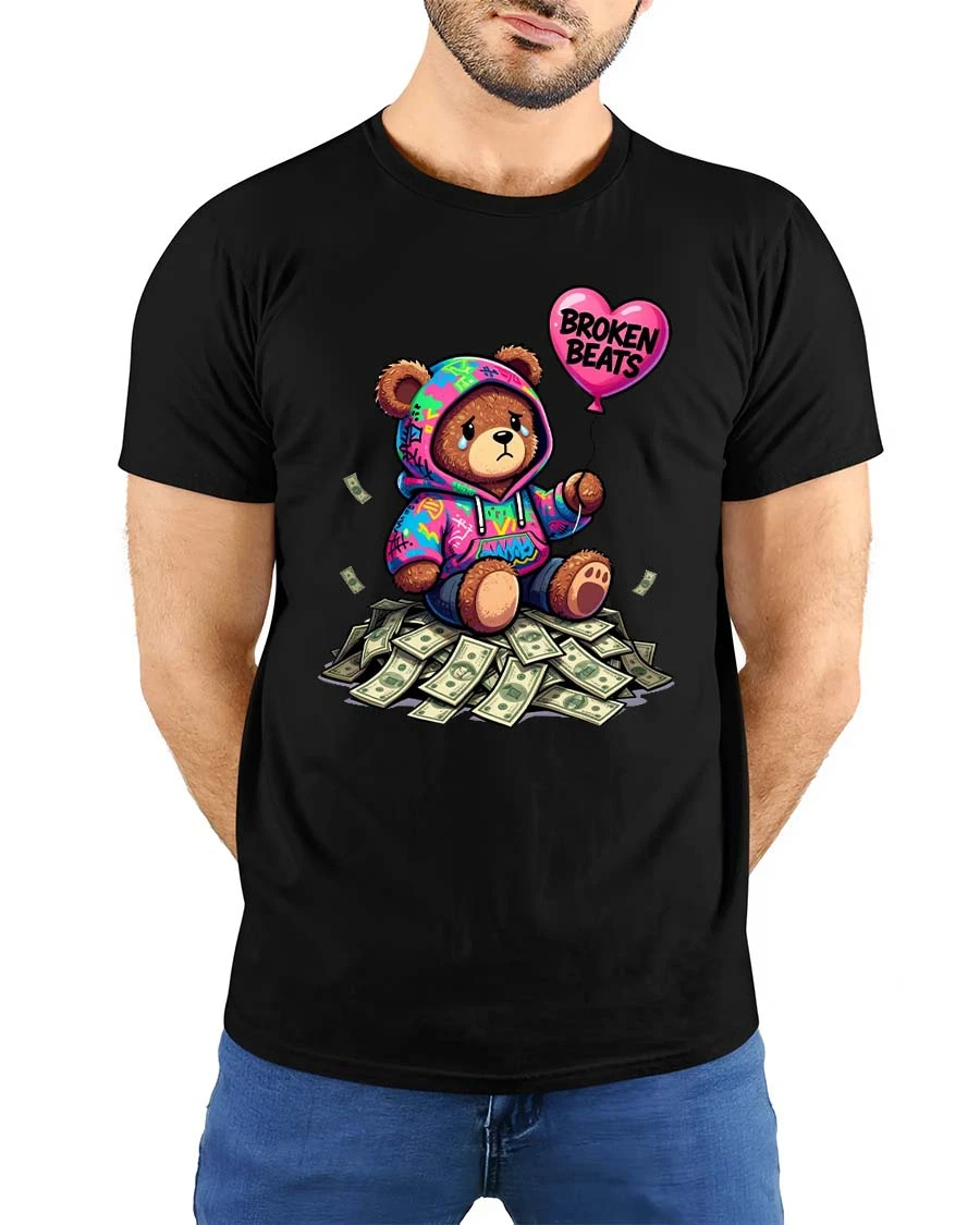 The Broken Beats Teddy Bear Graphic T Shirt features a unique and emotional street-style design of a sad teddy bear sitting on a pile of money while holding a heart-shaped balloon that reads “Broken Beats.” Wearing a colorful hoodie, the bear shows a mix of vulnerability and urban attitude, creating a powerful visual contrast between wealth and emotion.