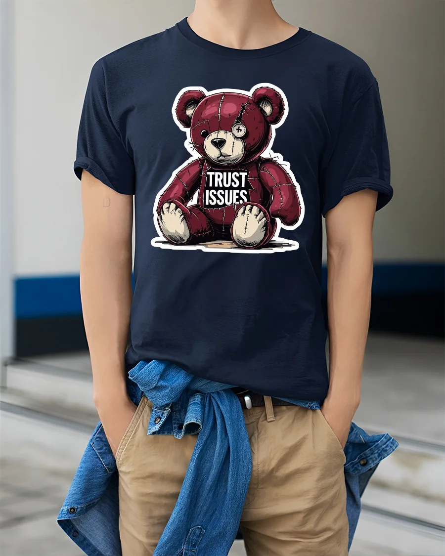 The stitched teddy bear and the “Trust Issues” text make this tee stand out with its mix of vulnerability and rebellion.