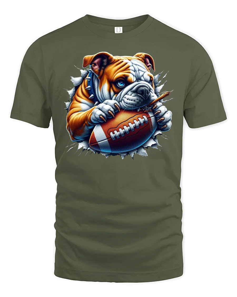 Featuring a fierce bulldog biting down on a football bursting through the fabric, this tee is perfect for sports fans and dog lovers alike.