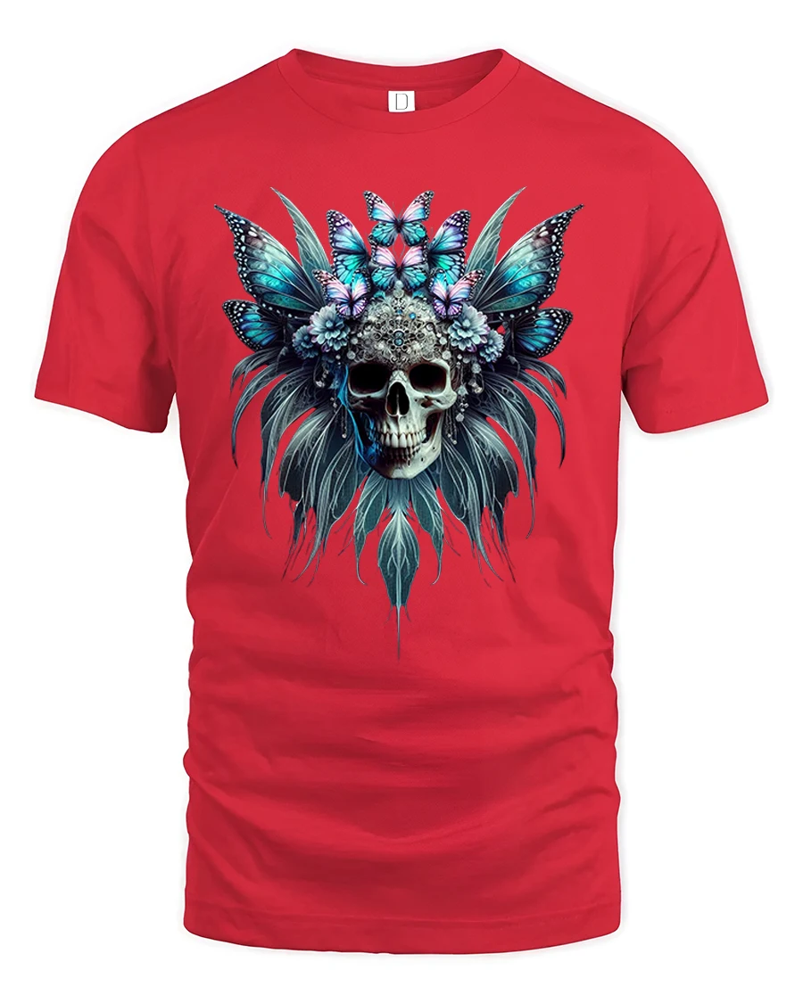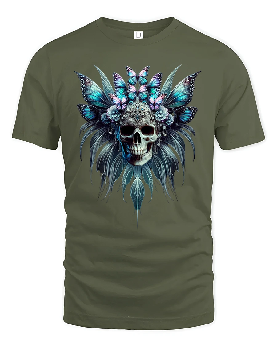 Butterfly Skull Headdress Gothic Fantasy Art T-Shirt combines the beauty of life and death in one striking design. Featuring a detailed skull crowned with blue and violet butterflies surrounded by feathers and flowers, this tee captures the perfect balance between elegance and mystery. It’s a powerful symbol of transformation, freedom, and dark beauty.