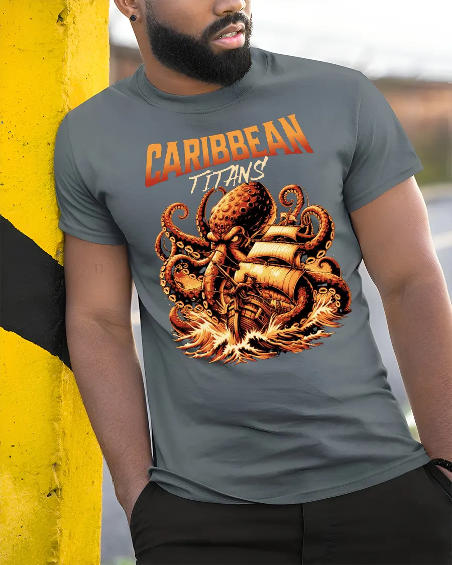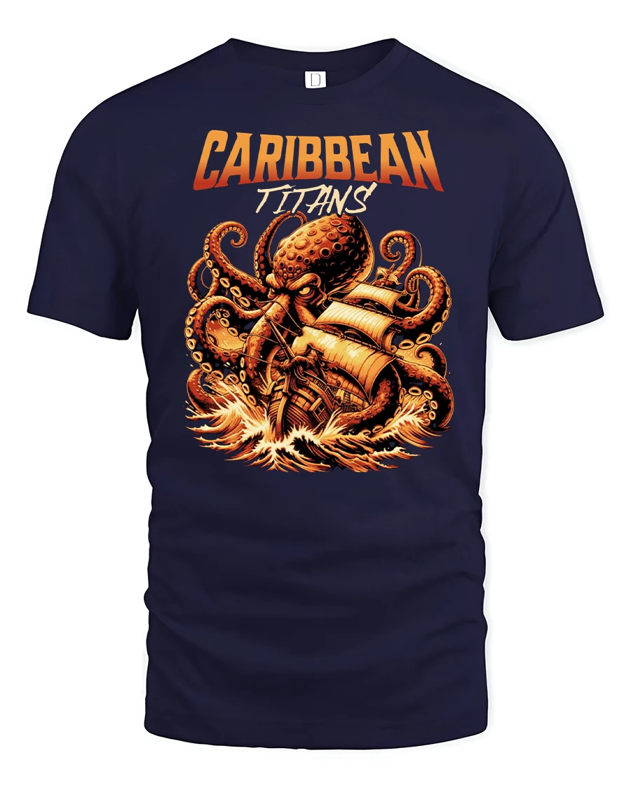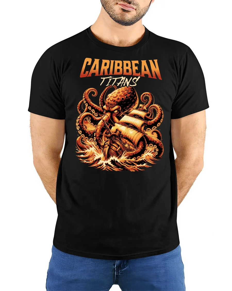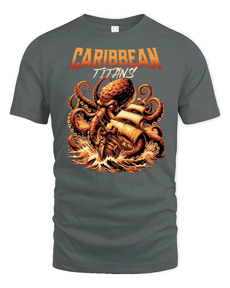 Unleash your inner adventurer with the Caribbean Kraken Attack Pirate Ship Graphic Tee. This bold design features a powerful octopus wrapping its massive tentacles around a ship, bringing the legendary sea monster myth to life. With fiery tones and stunning details, this tee is perfect for fans of pirate lore, ocean legends, and fantasy art.