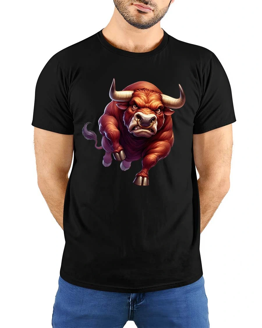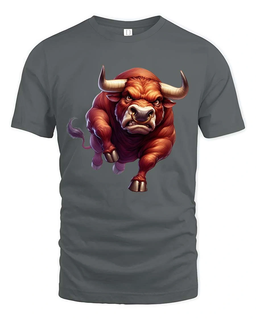 Unleash raw power with this bold charging bull t-shirt featuring a fierce, muscular bull in full motion.