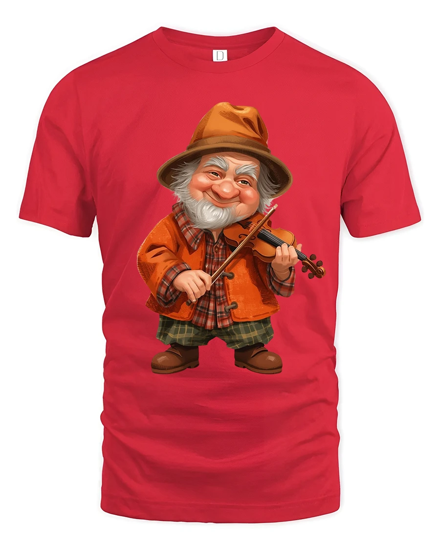 Cheerful Old Fiddler Cartoon Music Graphic Tshirt Cozy Folk Style - red t-shirt on white background