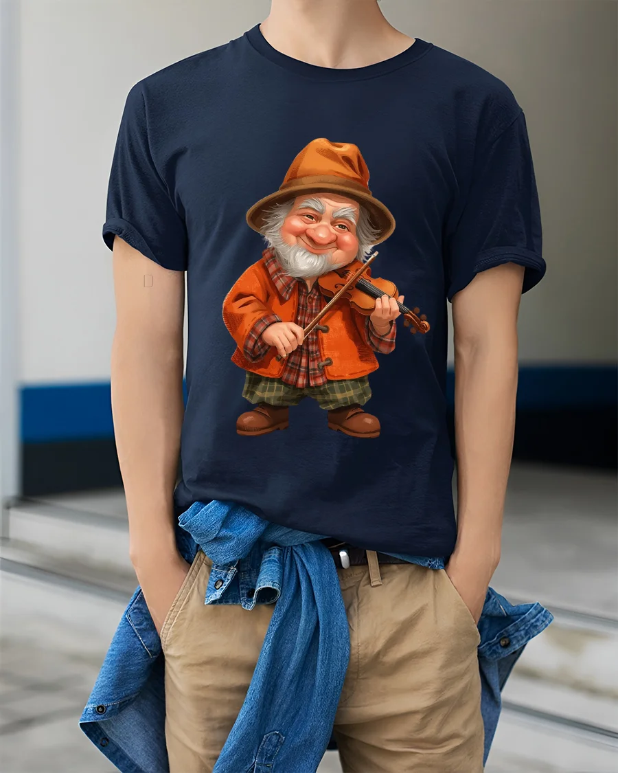 Cheerful Old Fiddler Cartoon Music Graphic Tshirt Cozy Folk Style