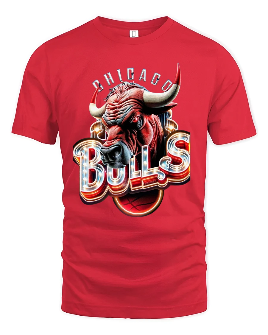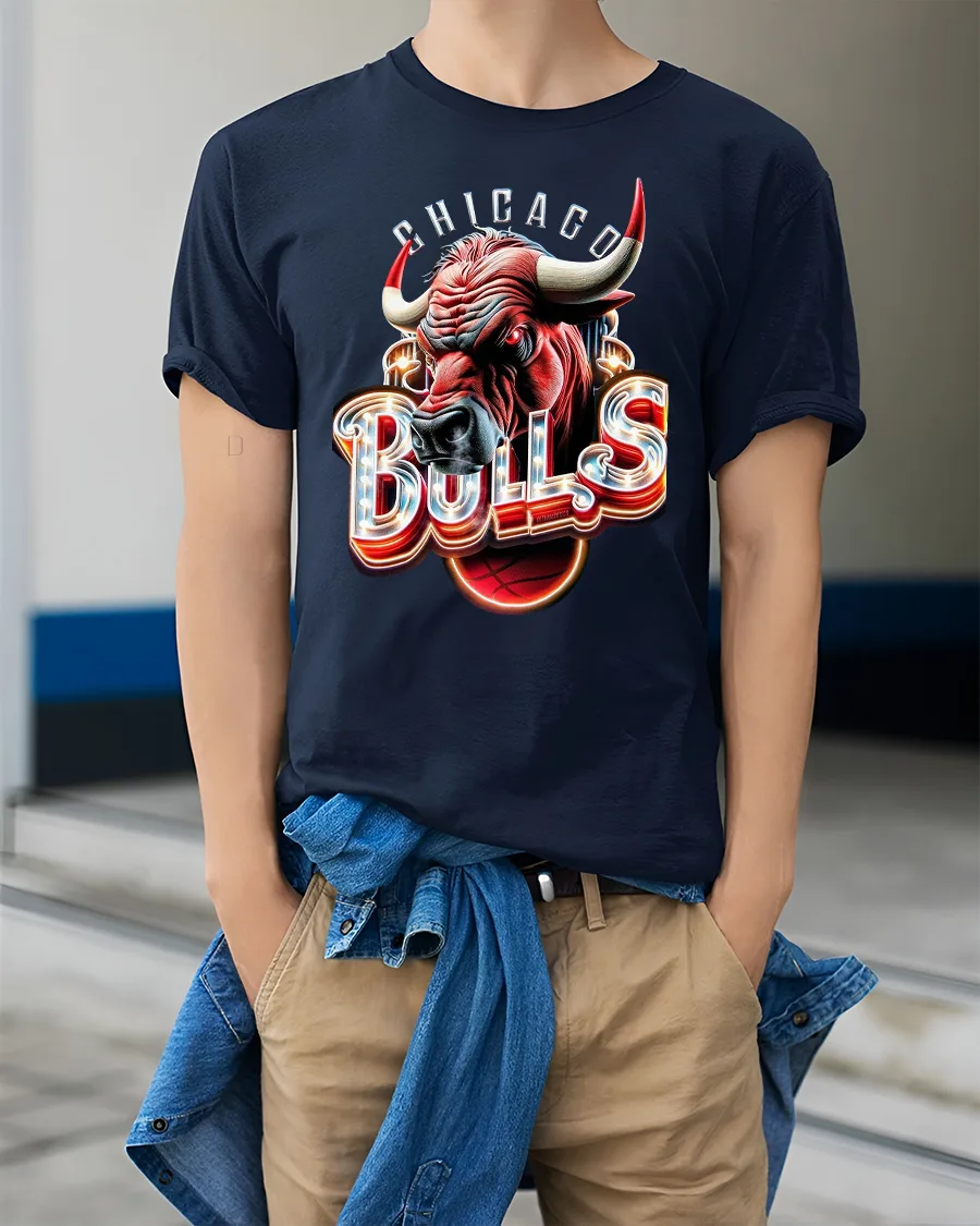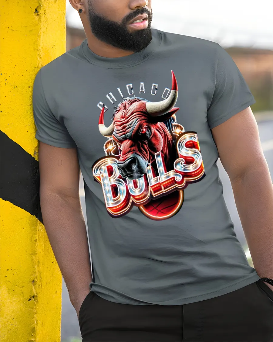 Chicago Bulls Inspired Power Bull Graphic T Shirt With Neon Edge delivers bold visual impact through a dramatic bull themed basketball design.
