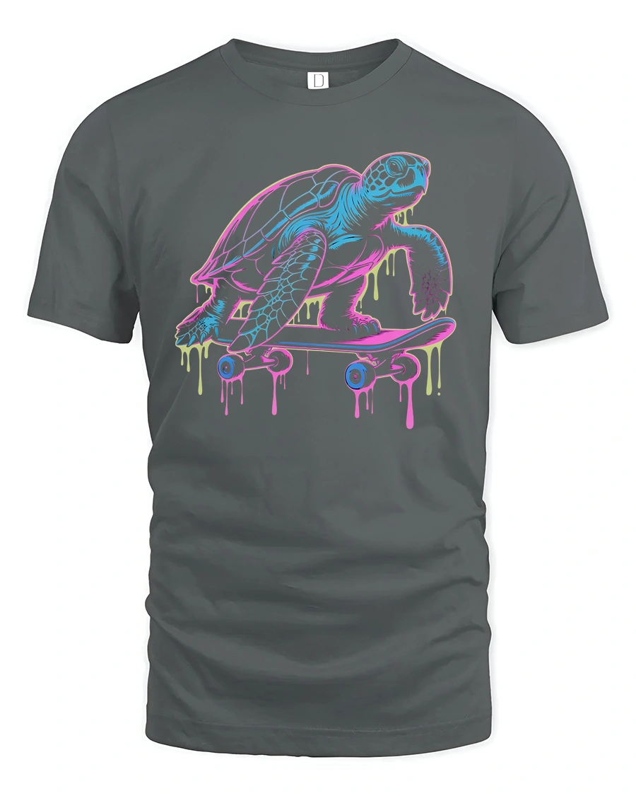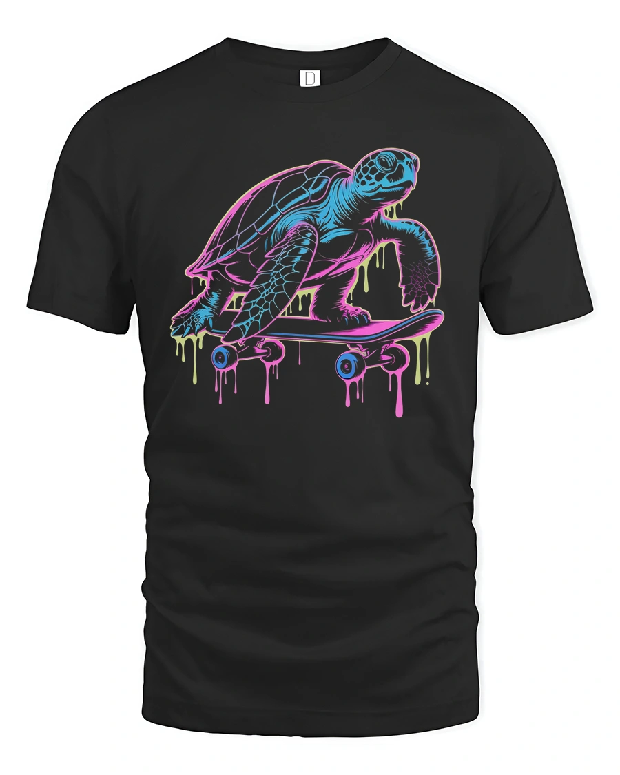 Featuring a neon turtle cruising on a skateboard with dripping paint accents, this tee is perfect for anyone who likes to keep it cool and laid-back.