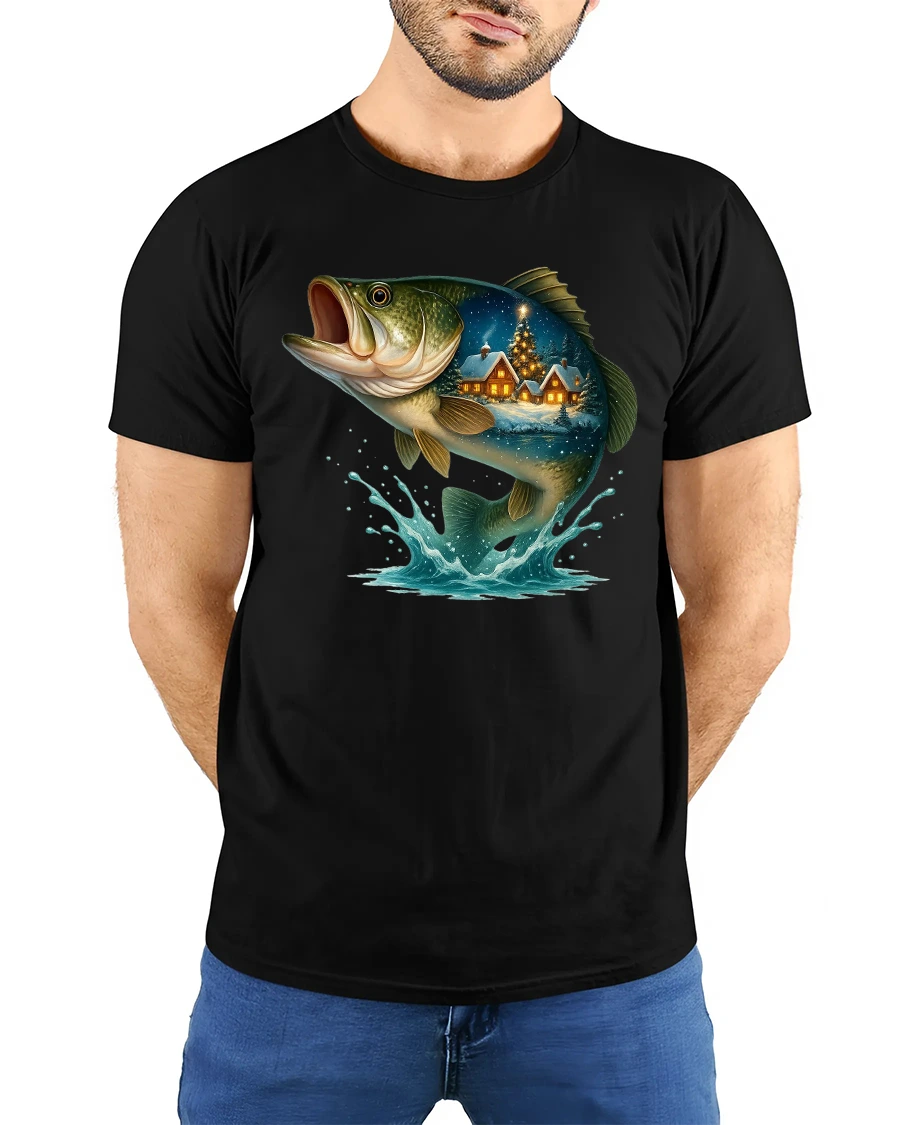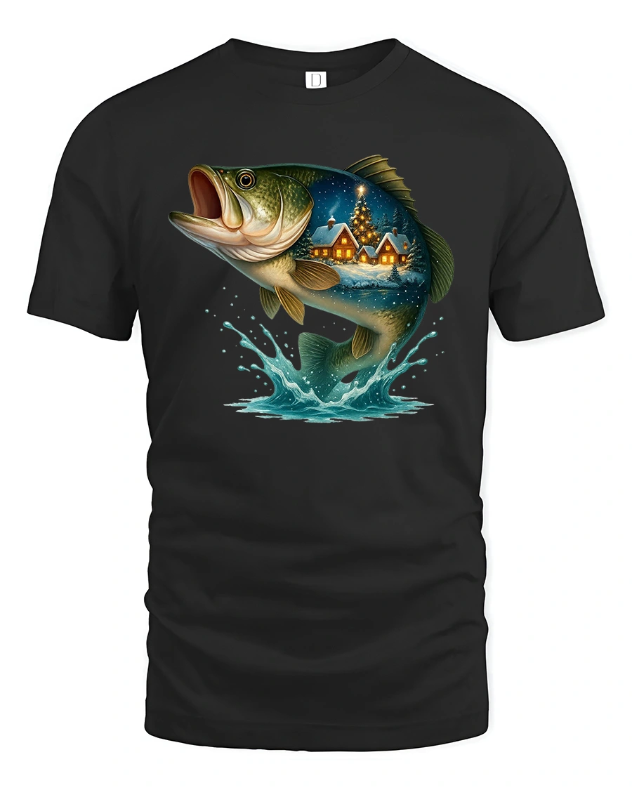 Featuring a majestic bass leaping from the water with a cozy snow-covered cabin scene inside its body, this tee perfectly blends outdoor adventure with festive charm.