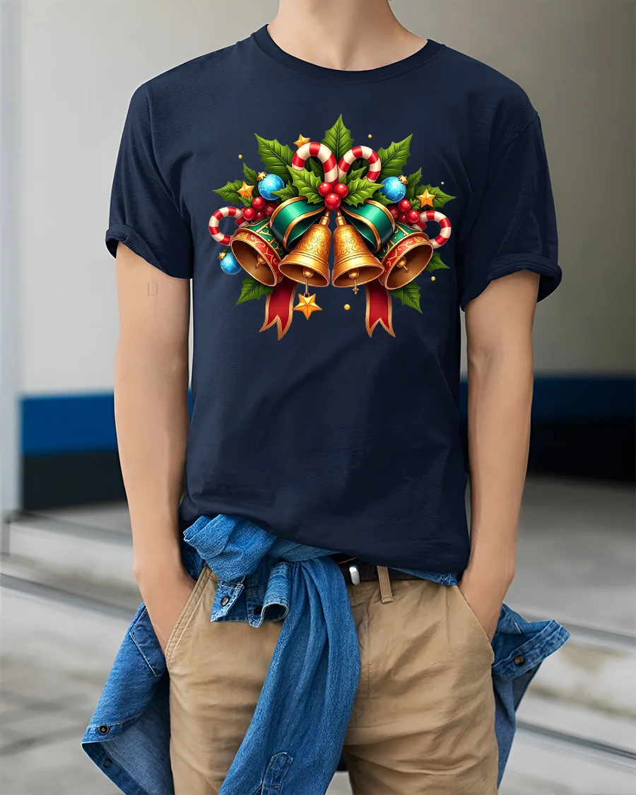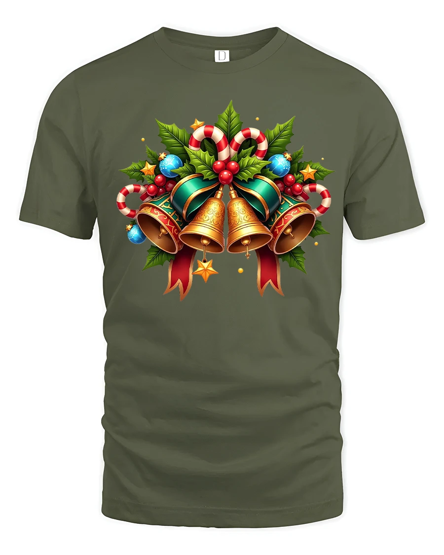 Christmas Bells Holiday Tee with Candy Canes and Holly Art brings classic Christmas charm to your seasonal wardrobe. This beautifully detailed graphic features shining gold bells, bright candy canes, holly leaves, red berries, and festive ribbons, all arranged in a cheerful holiday cluster that instantly captures the spirit of the season. The vivid colors and traditional Christmas elements make this design perfect for spreading holiday joy wherever you go.
