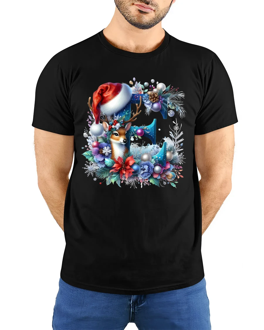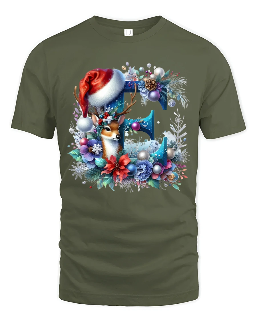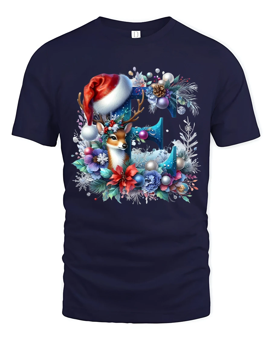 Christmas Floral E Initial Tee with Cute Deer Holiday Design brings elegance and festive charm to your seasonal wardrobe. The beautifully illustrated letter E is surrounded by vibrant Christmas flowers, sparkling ornaments, frosted greenery, and winter berries. A sweet reindeer wearing a holiday accessory and a fluffy Santa hat adds warmth and personality to the artwork, creating a visually rich and joyful design.