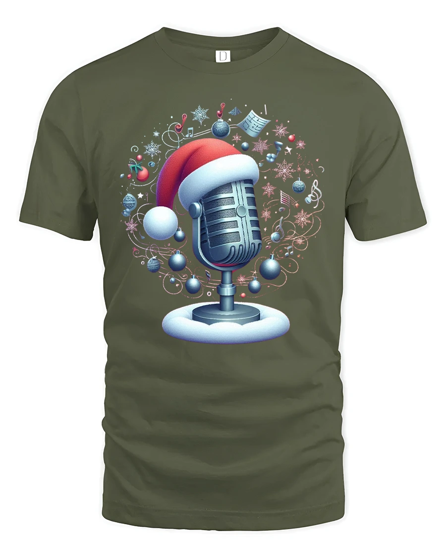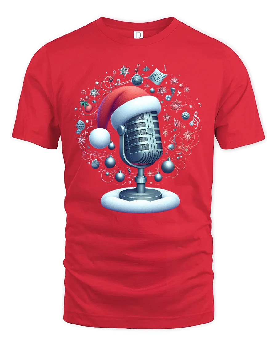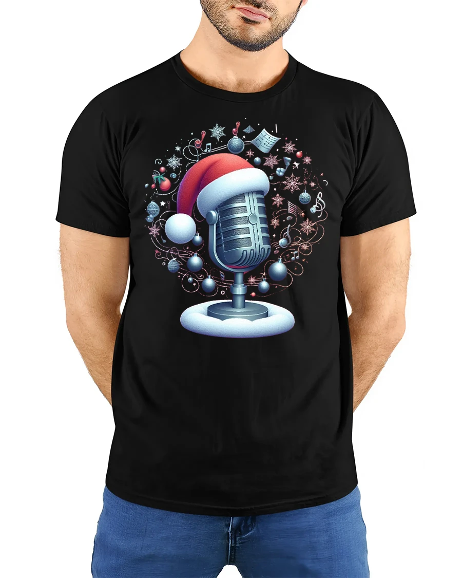 Wearing the Christmas Microphone Santa Hat Musical Holiday Magic Tee adds warmth and personality to any winter outfit. The detailed artwork stands out beautifully, making it a fun choice for concerts, parties, holiday gatherings, or relaxed seasonal wear. Its joyful theme makes it an excellent conversation starter and a charming addition to any collection of Christmas apparel.