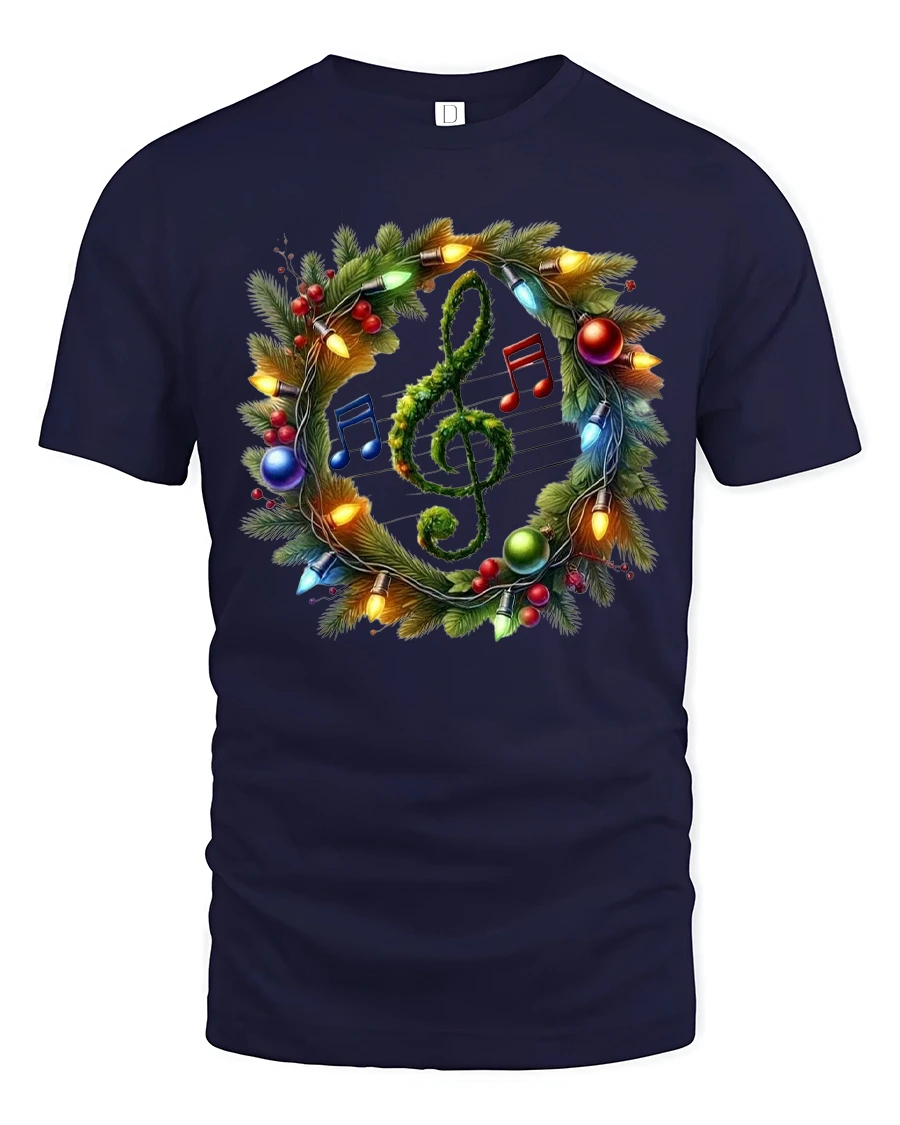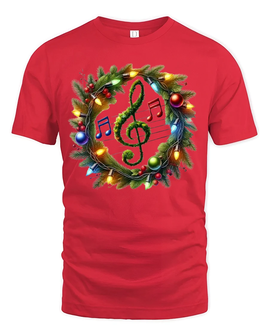Christmas Music Wreath Tee with Treble Clef Holiday Lights brings the joyful harmony of the season to your wardrobe. Featuring a beautifully detailed Christmas wreath wrapped in glowing lights, colorful ornaments, and musical notes surrounding a green treble clef, this tee blends festive cheer with musical passion. Its vibrant artwork makes it a perfect choice for musicians, singers, music teachers, choir members, and anyone who loves holiday carols.