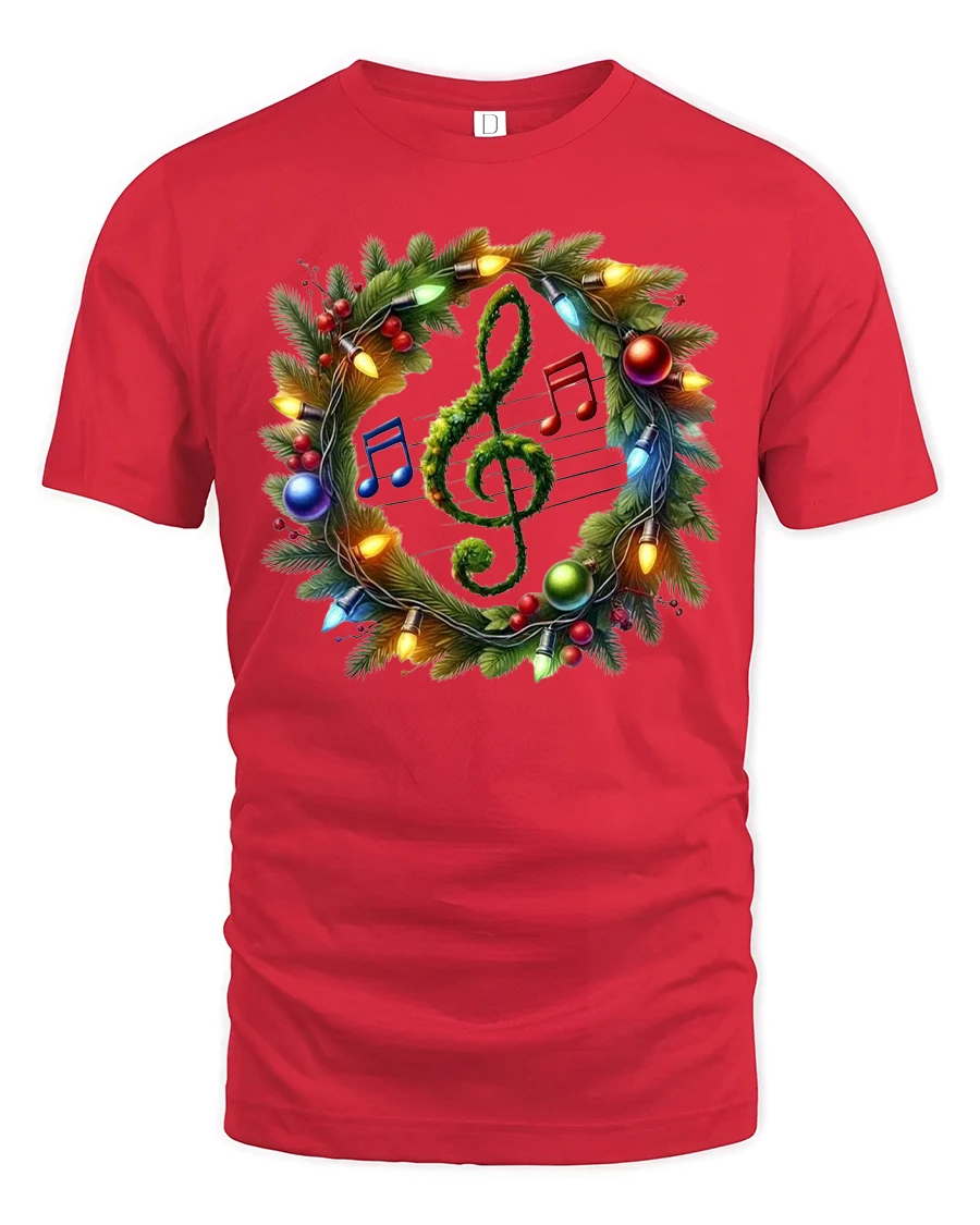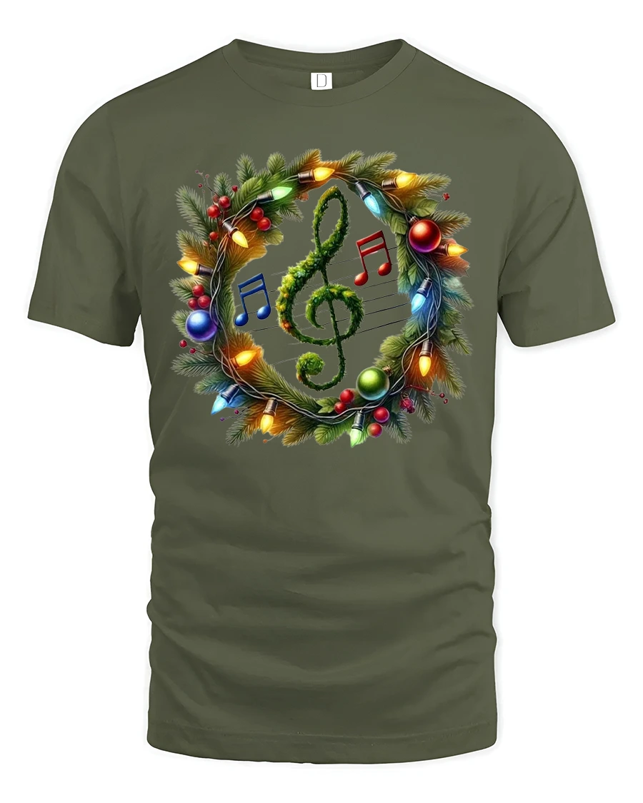 Christmas Music Wreath Treble Clef Holiday Lights Graphic Tee brings together the joy of the holiday season and the beauty of musical expression. Featuring a detailed Christmas wreath decorated with bright lights, ornaments, and a treble clef formed from festive greenery, this tee creates a cheerful and artistic design perfect for music lovers. The colorful music notes add extra charm, making this shirt stand out at concerts, gatherings, or any holiday celebration.