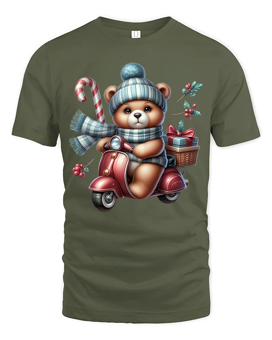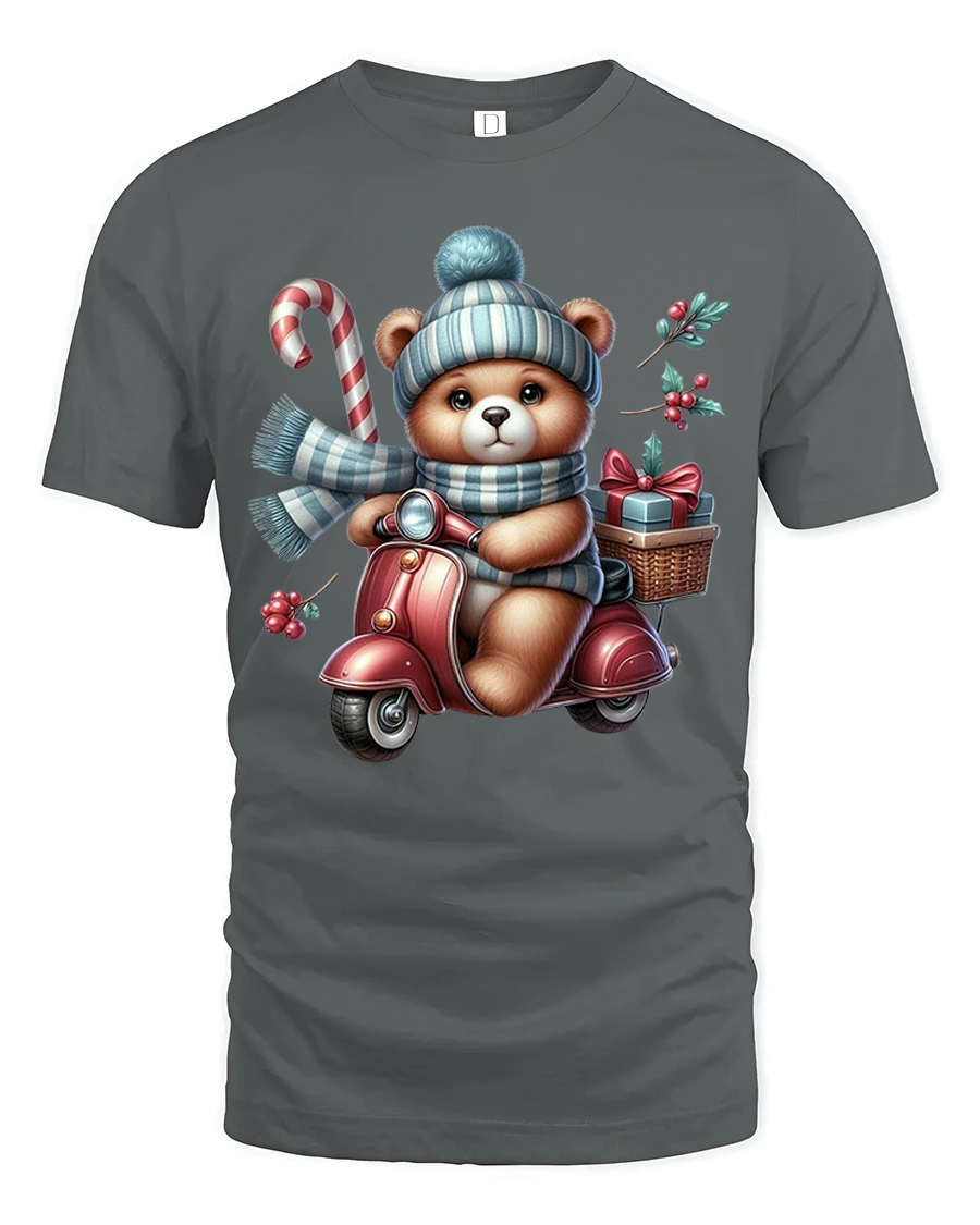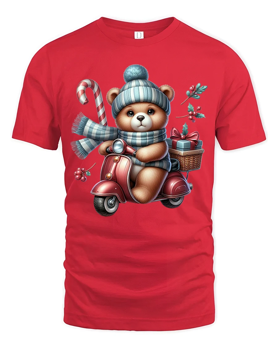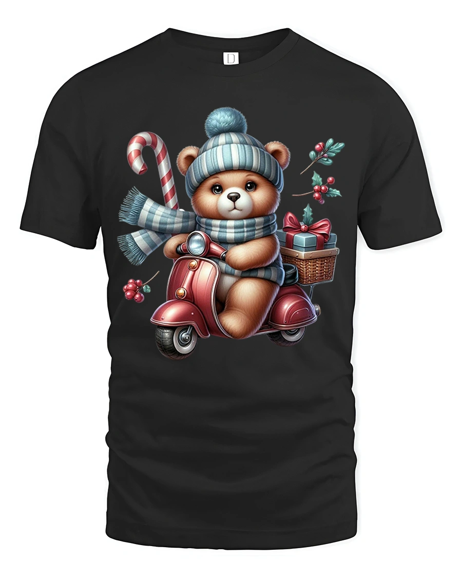 This Christmas Teddy Scooter Ride Tee with Candy Cane and Gifts brings cheerful holiday spirit to your wardrobe with its adorable, heartwarming artwork. The design features a cute teddy bear bundled up in a cozy winter hat and scarf, cruising on a festive red scooter with a basket full of wrapped presents. A giant candy cane and holly accents complete the charming seasonal look, making it perfect for holiday celebrations.