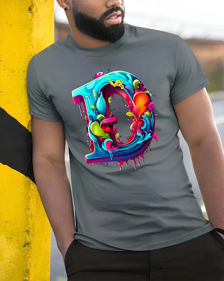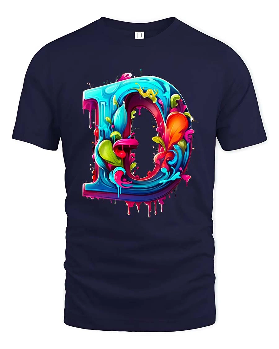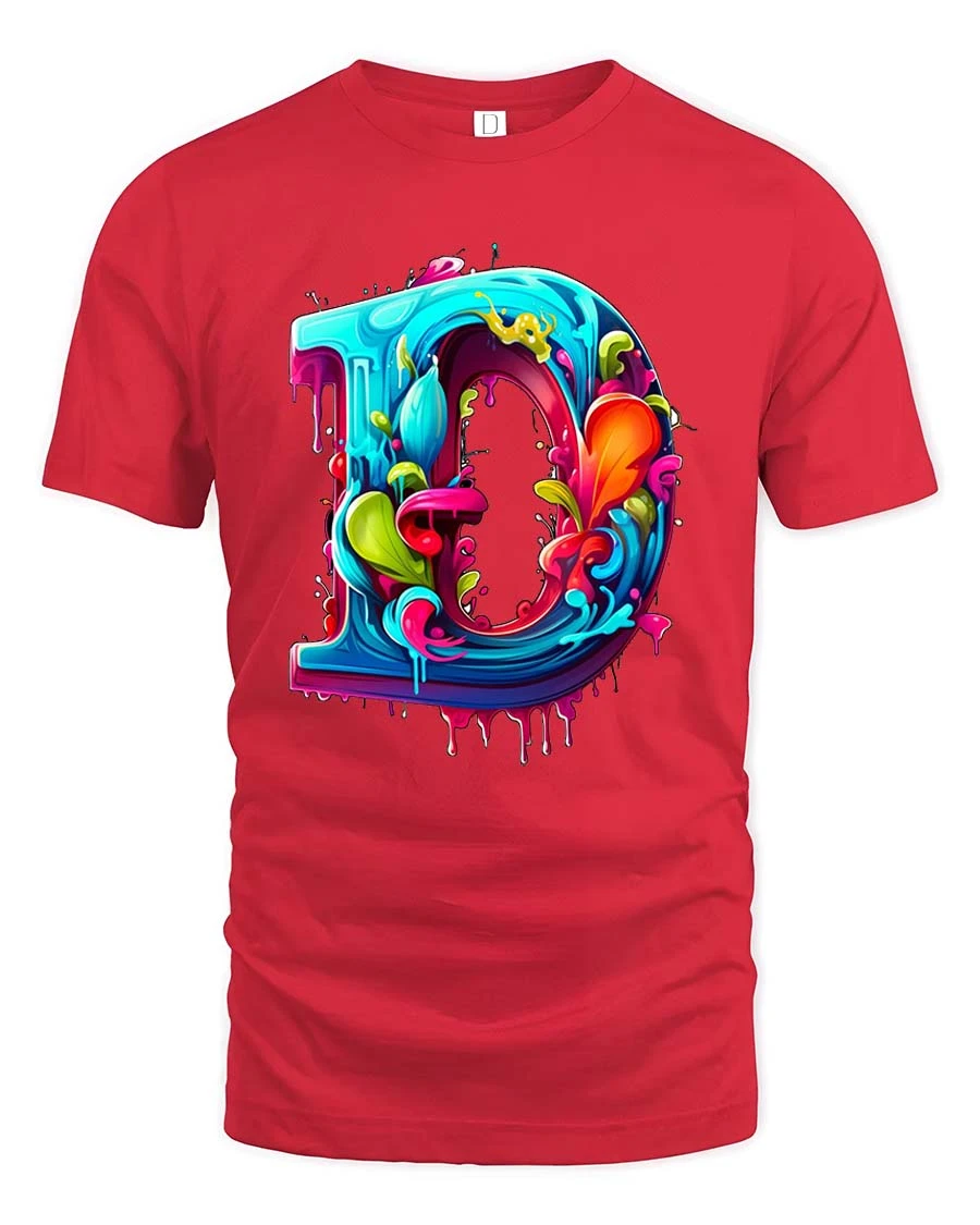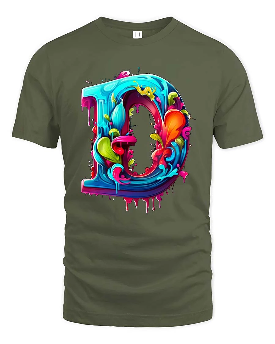 Color Splash Letter D Graffiti Art Style tshirt Vivid Ink brings a bold and creative twist to modern street fashion.
