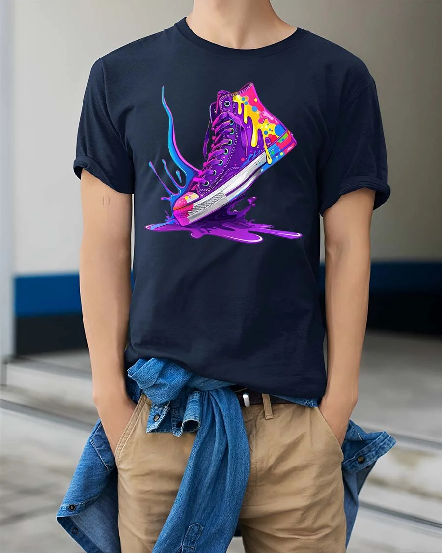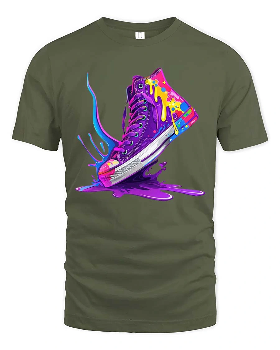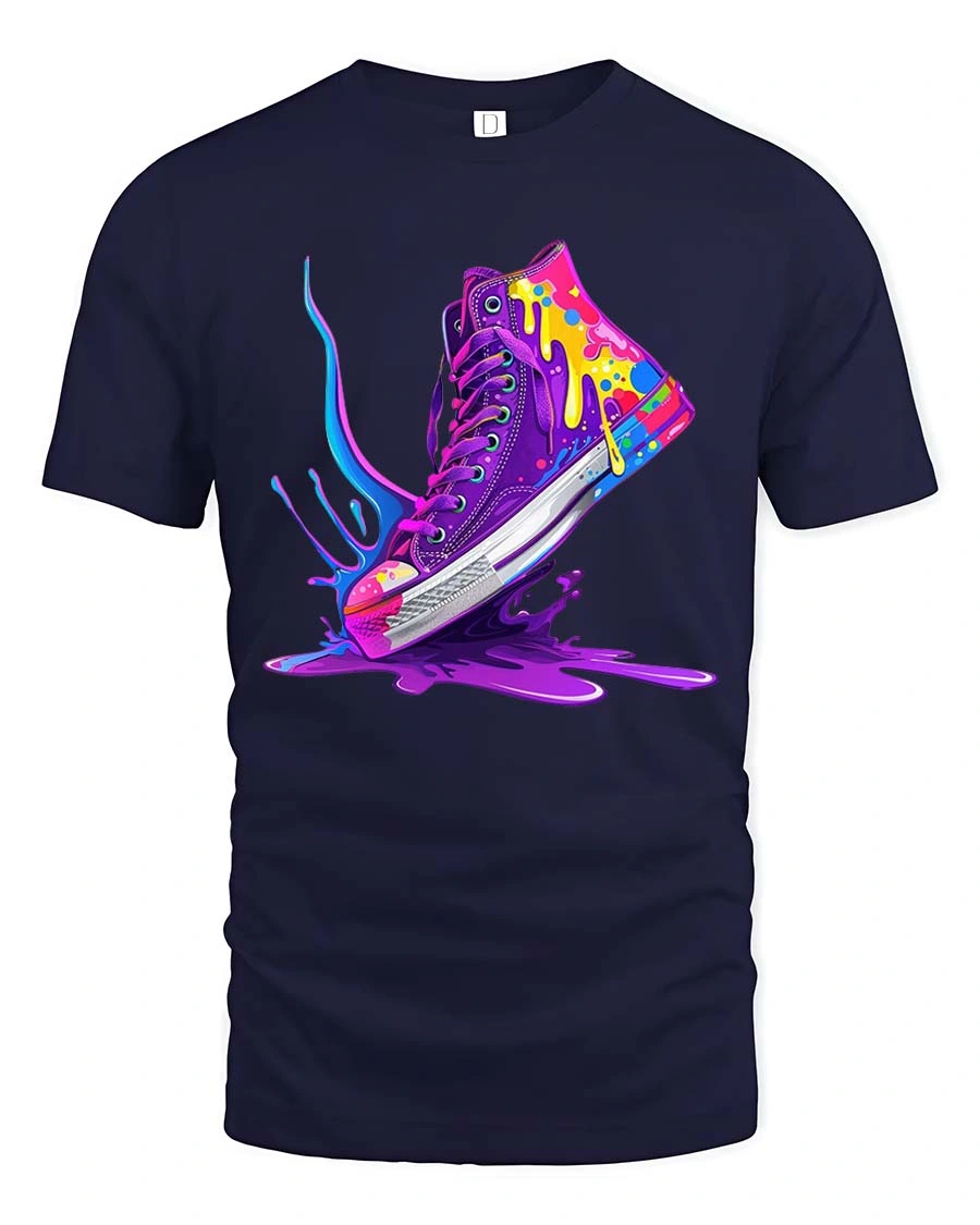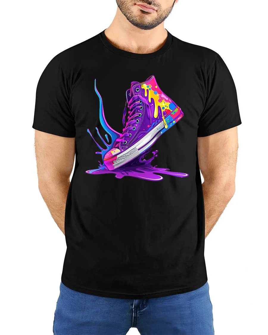 Featuring a vibrant sneaker design with dynamic paint splashes and dripping color effects, this graphic tshirt creates a striking visual that stands out with energy and style.