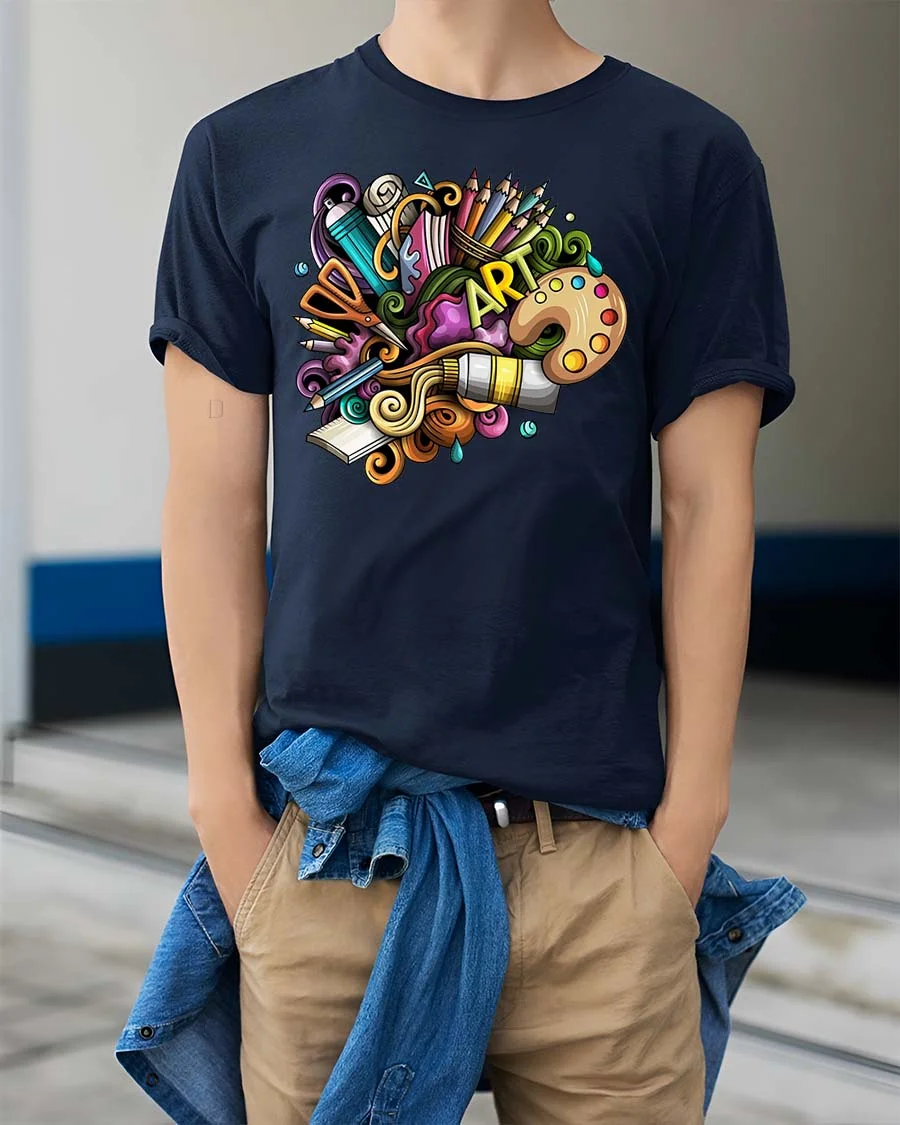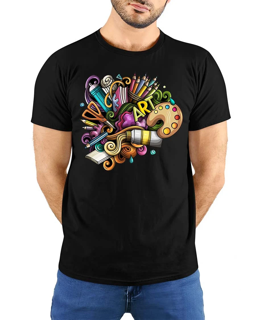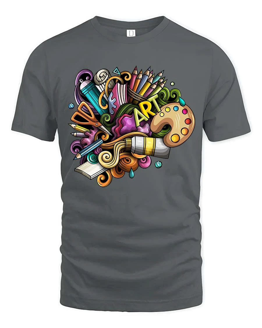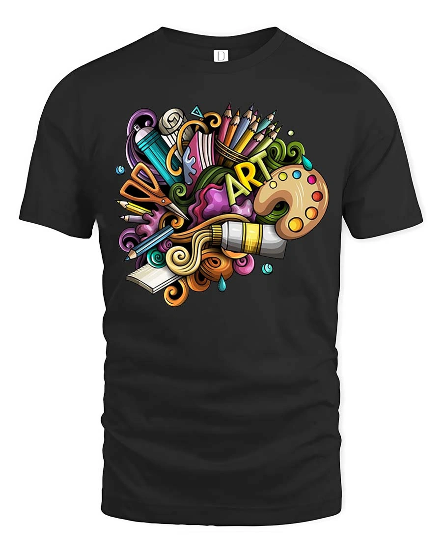 Featuring pencils, brushes, a paint palette, and creative elements arranged in a lively doodle style, this graphic tshirt captures the essence of imagination and artistic passion.