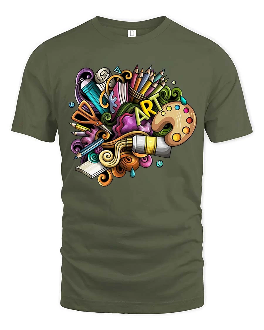 Colorful Art Supplies Creative Doodle Graphic T Shirt - military green t-shirt on white background