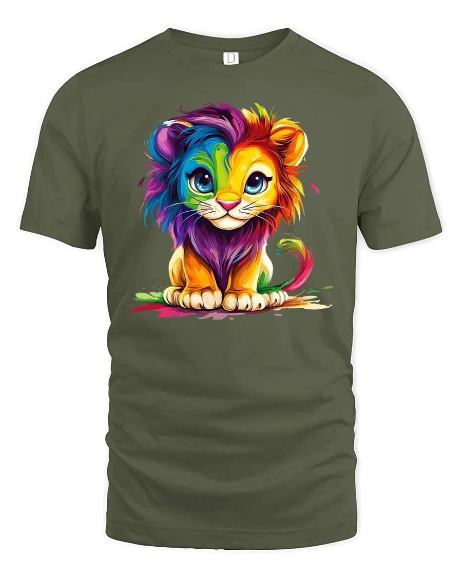 Colorful Baby Lion Art T-Shirt - military green t-shirt on white background