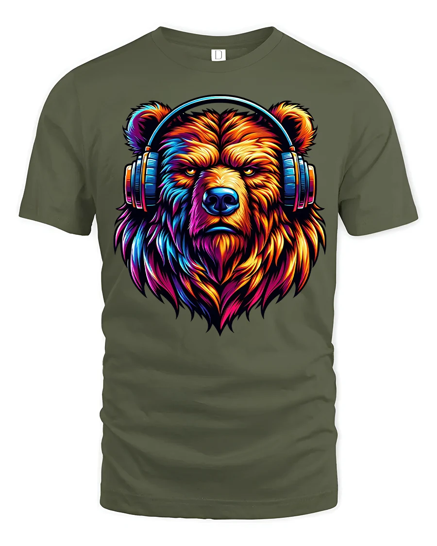 Colorful Bear Headphones Tee for Music Lovers Graphic Tshirt - military green t-shirt on white background