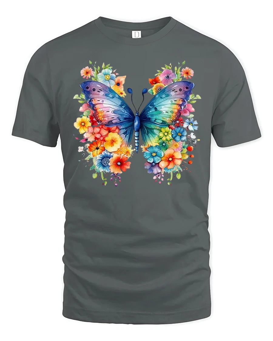 Featuring a detailed butterfly surrounded by blooming flowers in rich colors, this graphic tee brings a sense of harmony creativity and natural charm.