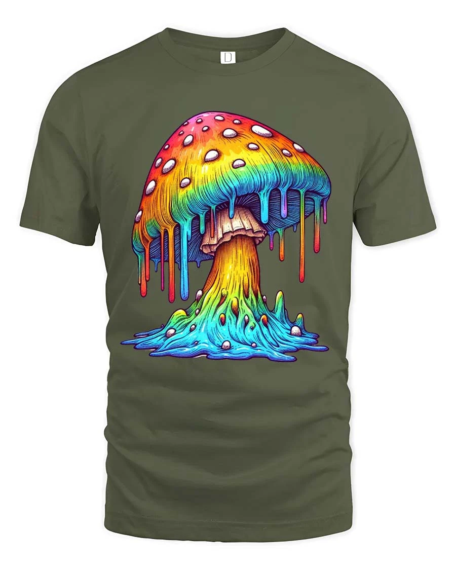 Colorful Dripping Mushroom Graphic T Shirt Psychedelic Art - military green t-shirt on white background