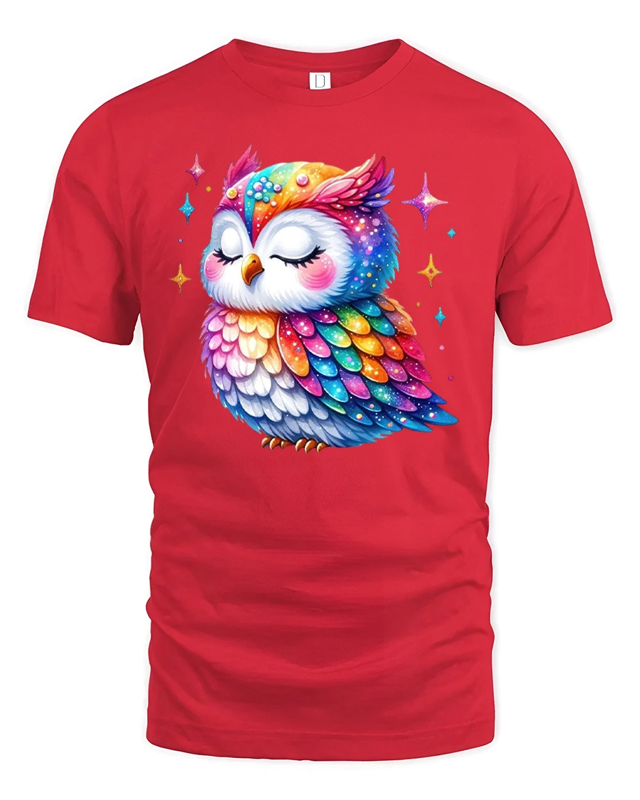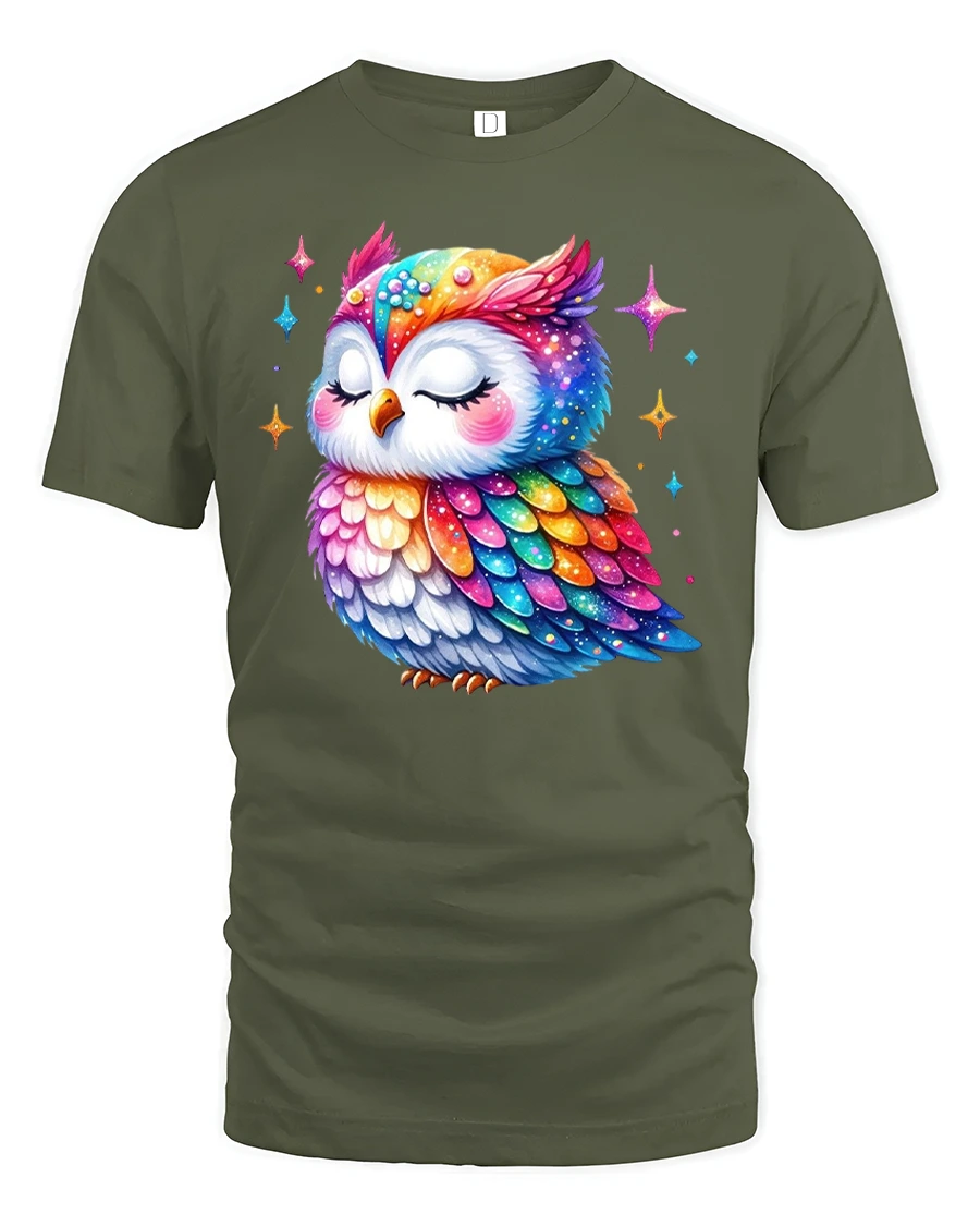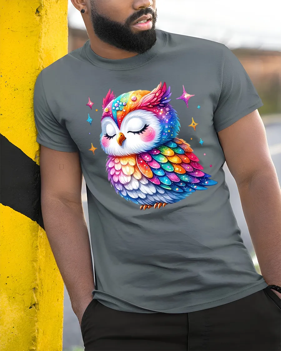 Featuring a beautifully detailed owl with rainbow feathers and a sparkling galaxy effect, this tee combines fantasy art with modern streetwear flair.